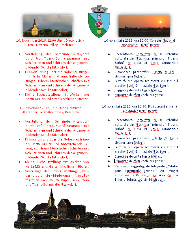 Invităm pe această cale pe toţi iubitorii Banatului Montan şi ai Reşiţei, tineri şi maturi, intelectuali şi simpli locuitori ai comunităţilor Banatului Montan, să vină să participe la o nouă întâlnire cu ing. Dan Perianu din Reşiţa, care va avea loc în data de 22 noiembrie, începând cu orele 17,00, la Biblioteca Germană „Alexander Tietz” din municipiul de pe Bârzava.