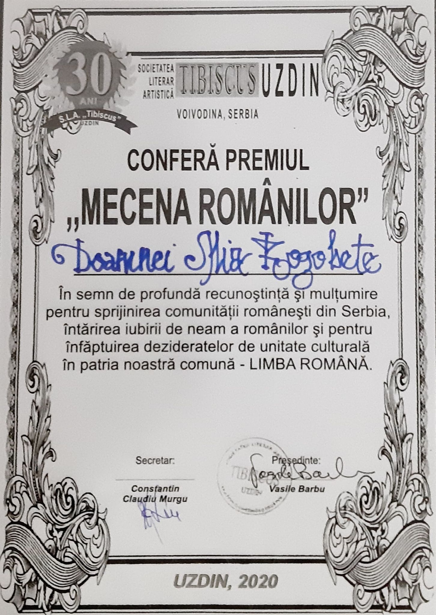 Nu este singurul premiu obținut de Maria Rogobete în această lună. Poeta lugojeancă a fost distinsă și cu Premiul ”Mecena românilor”, acordat de Societatea Literar-Artistică ”Tibiscus” din Uzdin, Serbia – președinte Vasile Barbu. Distincția a fost oferită în semn de profundă recunoștință și mulțumire pentru sprijinirea comunității românești din Serbia, întăririi iubirii de neam a românilor și pentru înfăptuirea dezideratelor de unitate culturală în patria noastră comună – limba română.