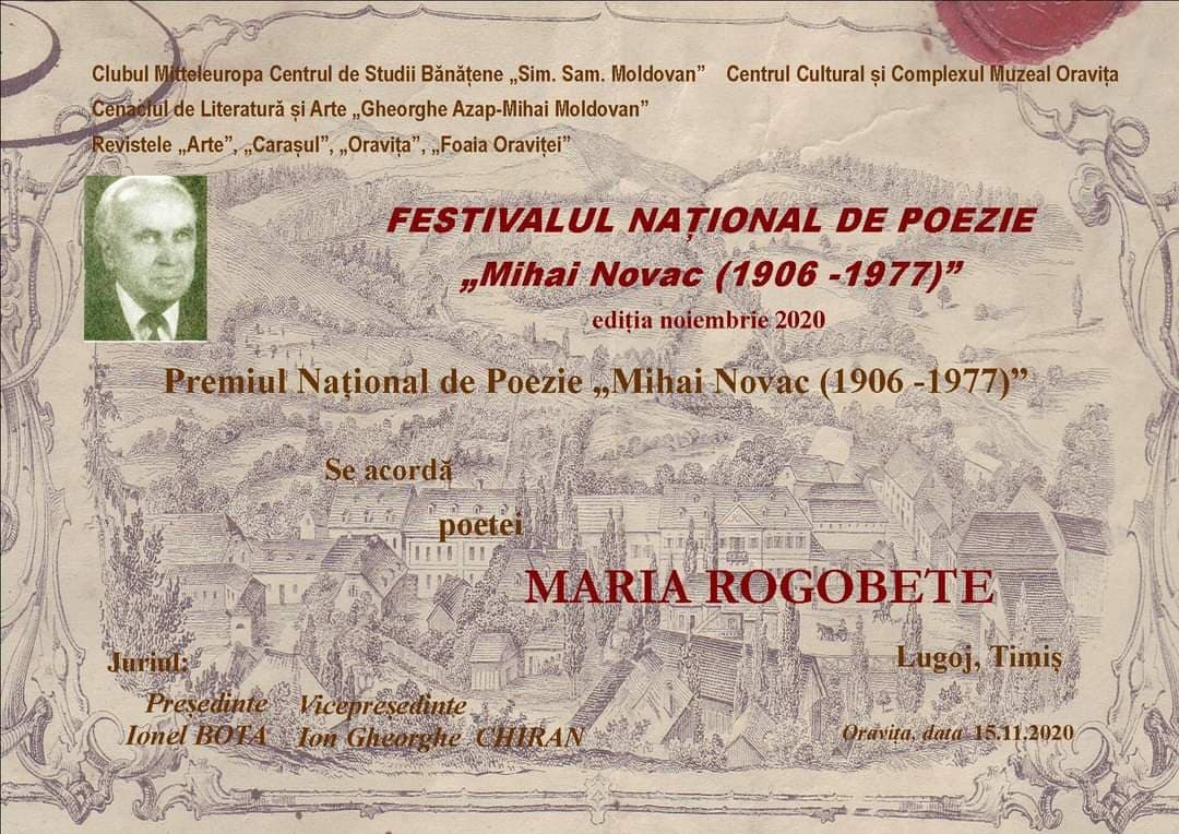 Luna noiembrie aduce noi distincții pentru Maria Rogobete, poetă, prozatoare și actriță a Teatrului Municipal “Traian Grozăvescu” din Lugoj. În cadrul Festivalului Național de Poezie ”Mihai Novac” (1906-1977), ediția noiembrie 2020, Mariei Rogobete, lugojeancă prin adopție, dar originară din Topleț, Caraș Severin, i-a fost acordat Premiul Național de Poezie ”Mihai Novac” (1906-1977).