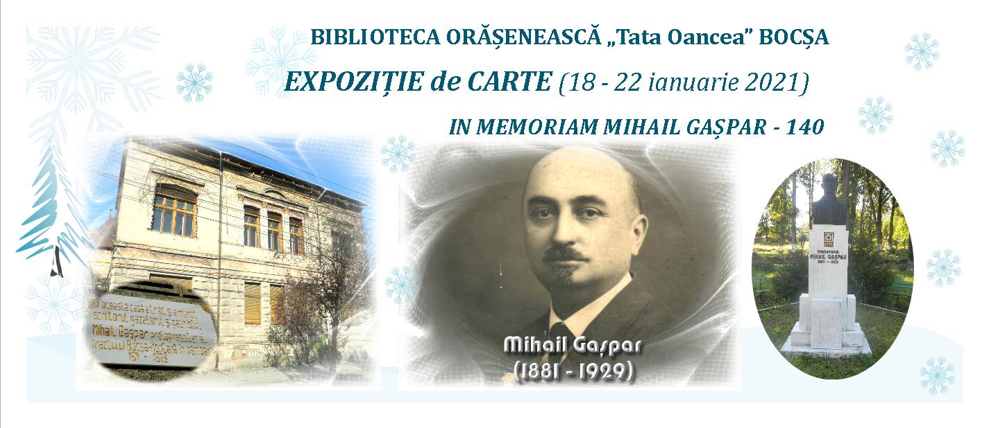 În perioada 18 – 22 ianuarie 2021, la sediul Bibliotecii Orășenești „Tata Oancea” Bocșa, Caraș-Severin, a fost expusă publicului expoziția de carte „In memoriam Mihail Gașpar – 140”.