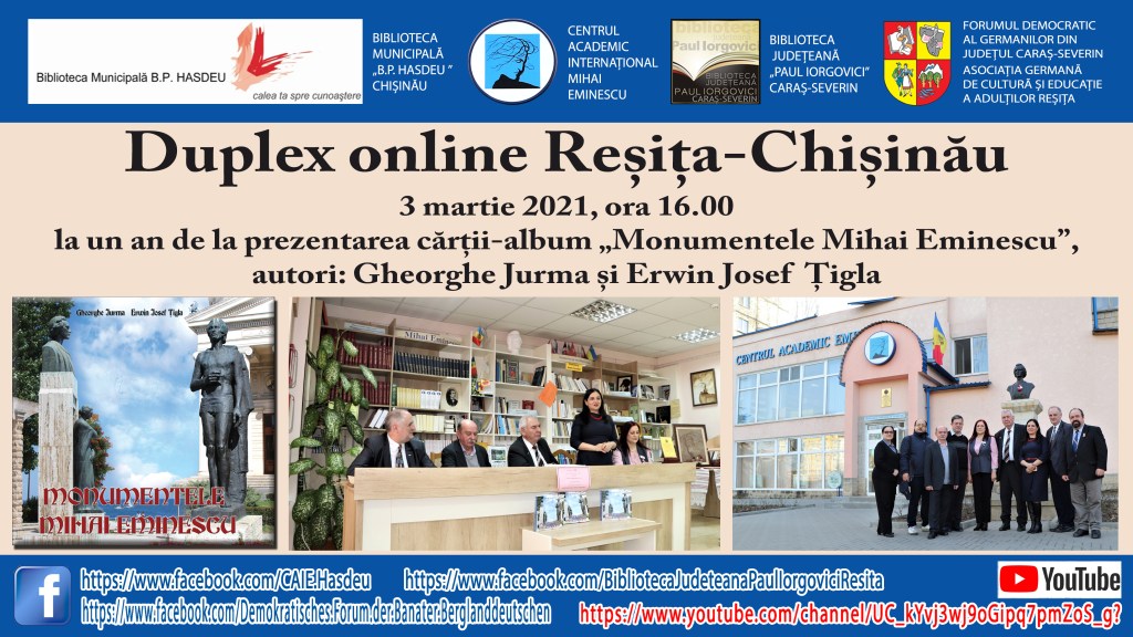 Pentru a rememora evenimentul din capitala Republicii Moldova, din Chișinău, Biblioteca Județeană „Paul Iorgovici” Caraș-Severin și Biblioteca Germană „Alexander Tietz” împreună cuCentrul Academic Internațional „Mihai Eminescu” Chișinău vor realiza un duplex online miercuri, 3 martie, începând cu ora 16.00, care poate fi urmărit pe rețelele de socializare ale instituțiilor partenere.
