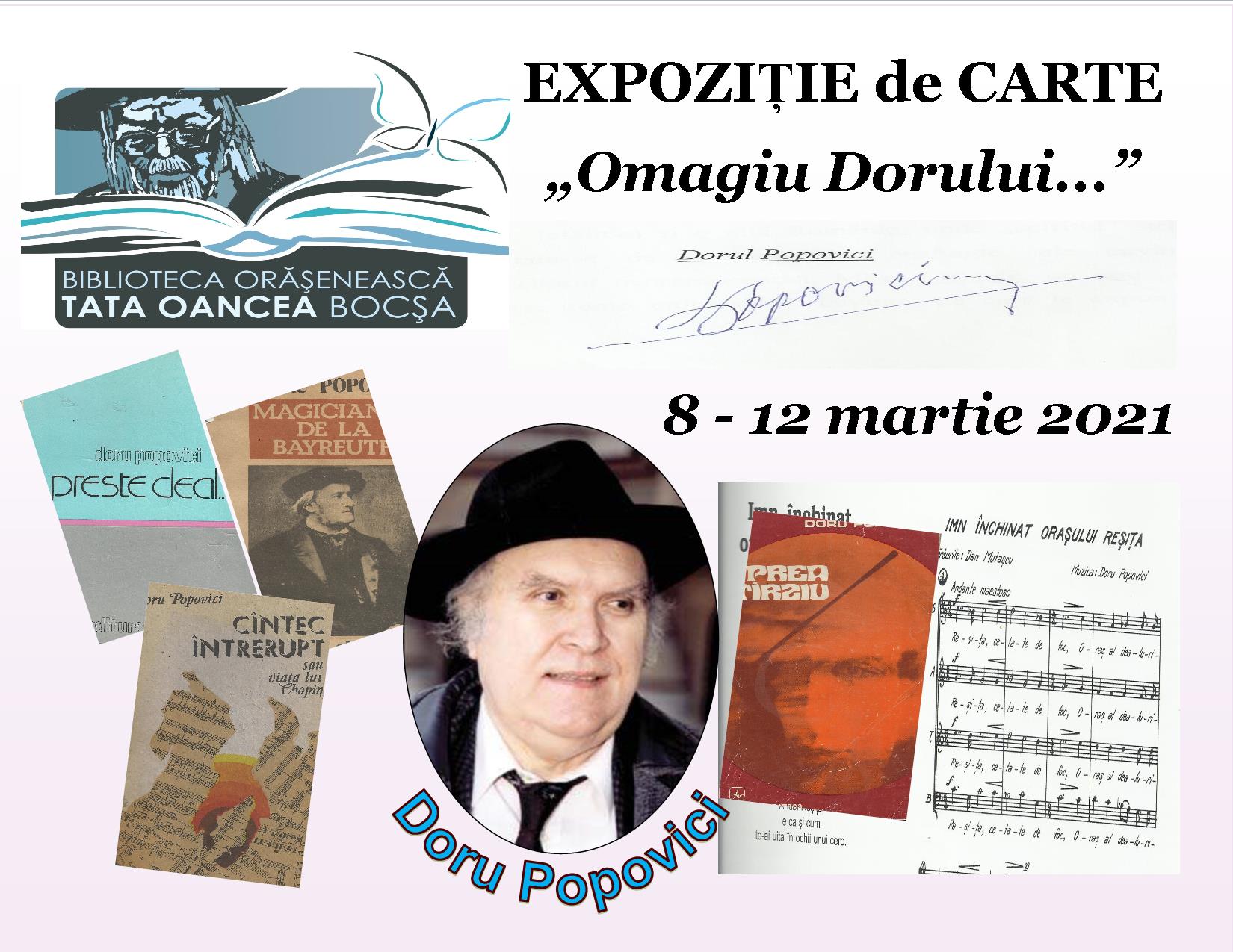 „Omagiu Dorului…” se intitulează expoziția de volume și documente care ni-l amintesc pe muzicologul bănățean Doru Popovici, plecat în urmă cu doi ani, într-o zi de 5 martie; apoi ni-l vom aminti pe regretatul lingvist Vasile C. Ioniță printr-o expoziție valoroasă și-l vom „aniversa” pe scriitorul și protopopul Vasile Petrica organizându-i, de asemenea, o săptămână pentru expunerea numeroaselor sale volume.