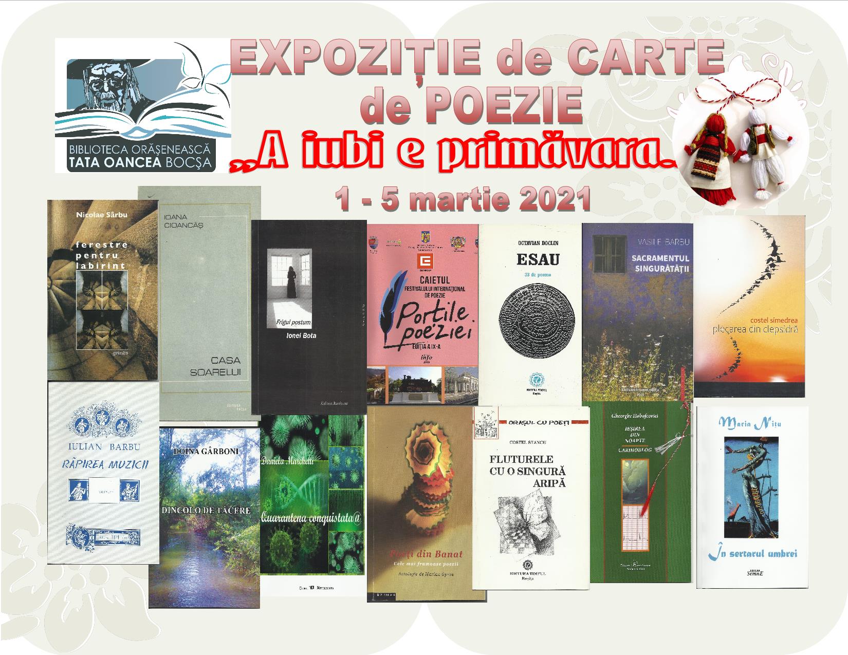Luna martie a anului 2021 la Biblioteca Orășenească „Tata Oancea” din Bocșa a debutat cu o expoziție de carte de poezie, expoziție care a adunat volume de versuri ale poeților bănățeni, apropiați bibliotecii și Bocșei culturale: Iulian Barbu, Octavian Doclin, Costel Stancu, Nicolae Sârbu, Liubița Raichici, Iacob Roman, Costel Simedrea, Ionel Bota, Vasile Barbu, Dinu Barbu, Robert Șerban, Ion Șerban Drincea, Daniela Marchetti, Ion Rășinaru, Ioan Petraș și Claudius Myron Ișfan au fost poeții etalați în această expoziție de început de martie și primăvară.