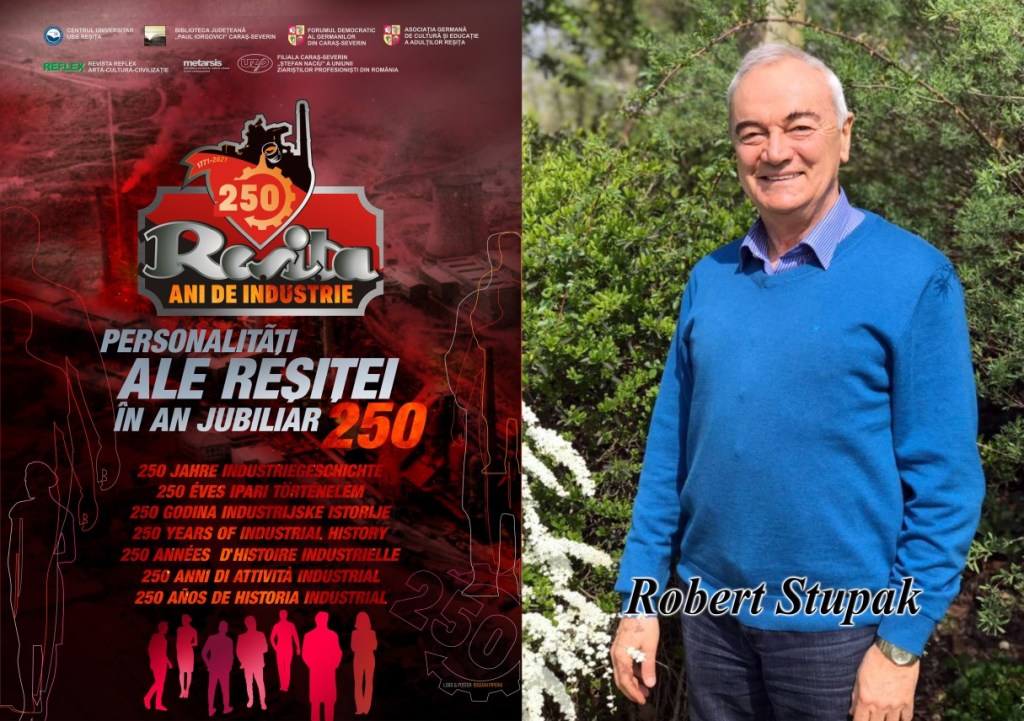 Robert Stupak, prof. pian, Gerlingen / Germania Ce înseamnă pentru Dumneavoastră Reșița la împlinirea a 250 de ani de industrie, sărbătoriți la 3 iulie 2021? Orașul Reșița, orașul meu natal, a însemnat totul pentru dezvoltarea mea ulterioară. Mama mea m-a îndrumat să fac muzică, așa că am intrat la Școala elementară de muzică din Reșița și am învățat pian cu doamna prof. Busch Barbara și teorie, solfegii cu domnul prof. Giurgiu Victor. Aici mi s-au pus bazele cunoștințelor mele muzicale pe care am putut să le dezvolt în continuare la Școala de muzică și arte plastice „Ion Vidu” din Timișoara și la Conservatorul de muzica „Gheorghe Dima” din Cluj. Tatăl meu care a lucrat la U.C.M.R – secția Motoare Diesel m-a învățat să joc tenis de masa și apoi am continuat să joc la Sala de sport de pe lângă cinematograful Muncitoresc din Reșița. Meseria de profesor de pian am practicat-o la Timișoara timp de 20 de ani, apoi m-am stabilit în Germania la Gerlingen, lângă Stuttgart, unde am practicat-o încă 30 de ani. Mereu sunt în legătură cu orașul Reșița, vizitez împrejurimile lui frumoase și vorbesc cu oamenii lui minunați. Le mulțumesc tuturor oamenilor care m-au ajutat de-a lungul timpului. Cu muzica și sportul început la Reșița am reușit să duc o viață bună și sănătoasă până în prezent. Ce gânduri trimiteți Reșiței și locuitorilor ei în an jubiliar? Doresc orașului Reșița să se dezvolte în continuare în toate direcțiile și să ofere locuitorilor lui posibilități de afirmare în toate domeniile. Reșițenilor mei dragi le doresc sănătate și împlinirea tuturor dorințelor.