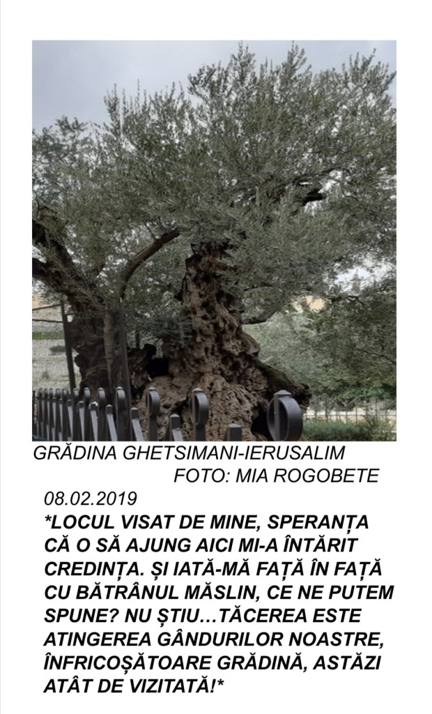 E Joia Patimilor, săptămâna Paștelui, oamenii merg la cumpărături, bătrânii încă mai sunt disperați să-și cumpere ce le trebuie încadrându-se în timpul primit de la guvern, copiii se urcă în copaci, mulți se tăvălească pe câmpurile din apropiere, la mine în suflet și-a făcut culcuș liniștea, simt că sunt atât de neputincioasă în fața inamicului, dar atât de fericită. Am aprins lumânarea de pe masa mea de lucru și gândurile s-au dus la poarta Grădinii Ghetsimani. În ziua aceea de pelerinaj, 8 februarie a lui 2019, stăteam rezemată de gardul din fier, foarte gros, și priveam măslinii bătrâni, scoarța lor îi dădea de gol, mii de găuri se arătau în tulpinile acestora, m-am uitat în stânga și în dreapta pentru a nu fi văzută și mi-am întins mâna spre cel mai apropiat măslin, l-am mângâiat, Doamne cât mi-am dorit acest lucru: L-am atins!!! Am atins măslinul cel mai bătrân!