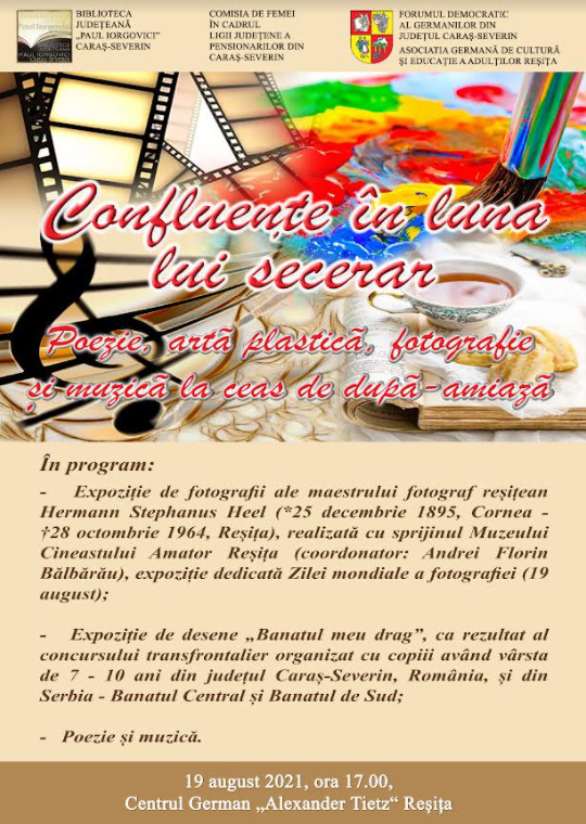 – Expoziție de fotografii ale maestrului fotograf reșițean Hermann Stephanus Heel (*25 decembrie 1954, Cornea – †28 octombrie 1964, Reșița), realizată cu sprijinul Muzeului Cineastului Amator Reșița (coordonator: Andrei Florin Bălbărău), expoziție dedicată Zilei mondiale a fotografiei (19 august);