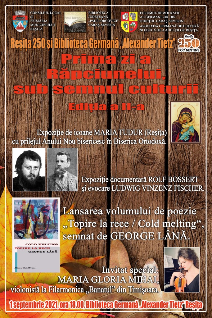 1 septembrie 2021, ora 18.00, Biblioteca Germană „Alexander Tietz“ Reșița: