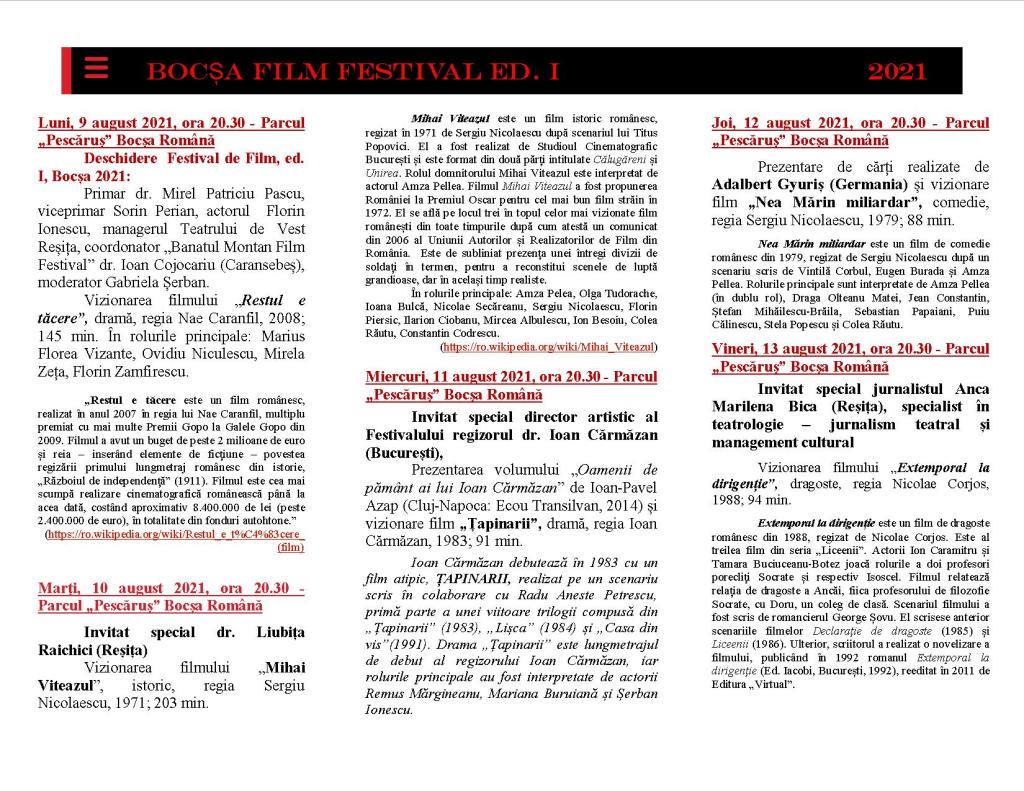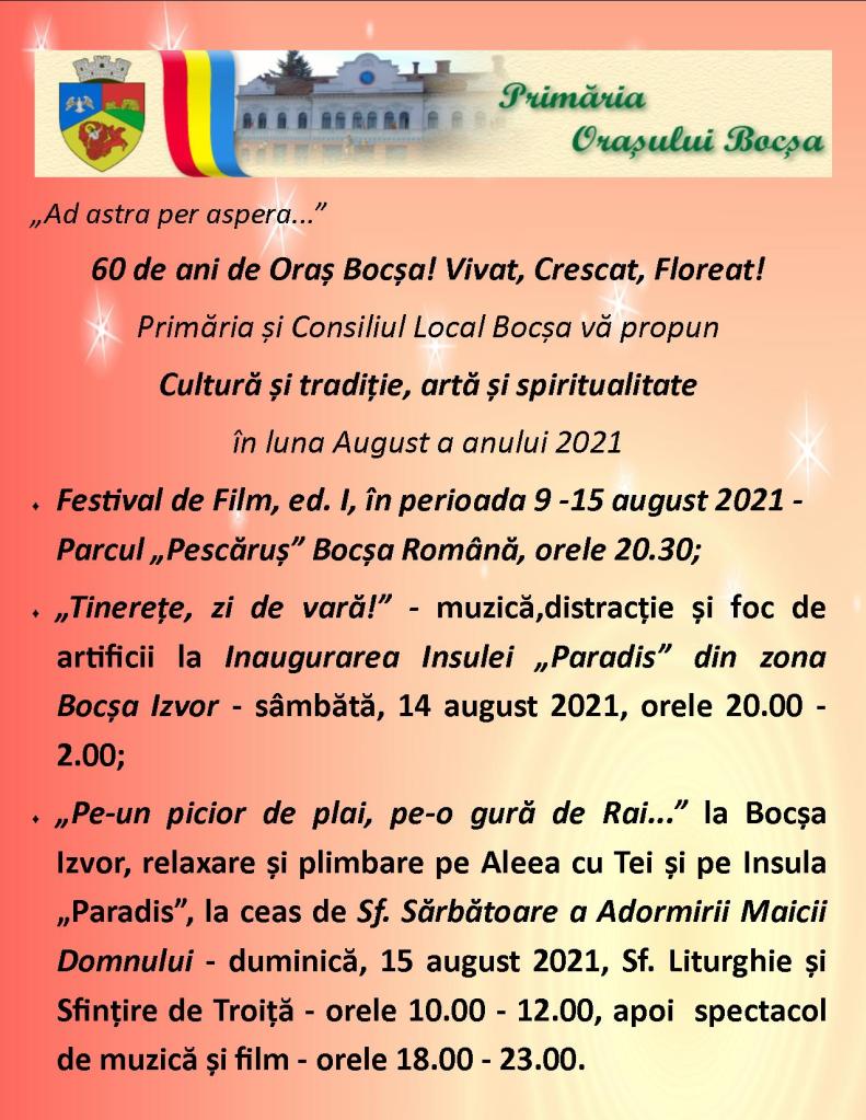 Iată că, anul în care orașul Bocșa împlinește 60 de ani de la înființare, urmează unei perioade de pandemie și nu numai. Urmează unei perioade de „adormire” din multe puncte de vedere. Așadar, în partea a doua a acestui an, orașul va fi sărbătorit în fiecare zi, cu fiecare lucrare efectuată în folosul comunității, cu fiecare nou proiect derulat sau inițiat, cu fiecare eveniment cultural desfășurat, cu reînvierea tradițiilor și readucerea istoriei locale pe harta cultural-turistică a orașului Bocșa! Unul dintre aceste noi proiecte derulate în luna august a acestui an este și „Banatul Montan Film Festival – Bocșa Film Festival” ediția I, desfășurat la Bocșa în perioada 9 – 15 august, la inițiativa regizorului Ioan Cărmăzan, prin strădania Bibliotecii publice bocșene. Așadar, prin acest Festival de Film vă propunem să reînvățăm să privim – împreună – un film, să stăm împreună, să citim -împreună- poezii și să ascultăm – împreună – scriitori de lângă noi! Prin acest proiect dorim să promovăm cartea, să promovăm filmul românesc și să ne bucurăm de valori autentice din imediata noastră apropiere: îl vom asculta pe actorul bocșean Florin Ionescu, cel care manageriază cu pricepere Teatrul Reșițean; ne vom bucura de poezia Liubiței Raichici, poeta care ne va recita și ne va povesti despre importante proiecte culturale cărășene precum Festivalul Internațional de Poezie; ne vom bucura de prezența bocșeanului, stabilit astăzi în Germania, Adalbert Gyuriș, care ne va recita și ne va prezenta noi apariții editoriale; vom fi onorați de prezența jurnalistei Anca Marilena Bica, specialist în teatrologie, care ne răsfață, zi de zi, cu emisiuni culturale de excepție la postul regional Radio Reșița; ne vom bucura de prezența tânărului actor bocșean Alexandru Moldovan, care vine de la București – special – pentru acest Festival de Film organizat la el acasă; îl vom admira, din nou, pe talentatul actor și regizor bocșean Dan Mirea, alături de extraordinara sa trupă a Teatrului DA și, nu în ultimul rând, ne vom bucura de prezența și vitalitatea, de dinamismul și savoarea regizorului bocșean Ioan Cărmăzan, inițiatorul Festivalului! Vă așteptăm să ne bucurăm împreună: de oameni, de poezie, de film, pe parcursul unei întregi săptămâni! Și, pentru că este o sărbătoare a orașului, vom încheia săptămâna cu muzică și dans, alături de film, într-o zonă mirifică a urbei noastre! Sâmbătă seara, pe Insula „Paradis”, recent amenajată la Bocșa Izvor (Bringl), bocșenii – și nu numai!- sunt invitați să admire un spectacol artistic, focul de artificii și să ia parte la o discotecă în aer liber. De asemenea, Parohia Romano-Catolică „Neprihănita Zămislire” din Bocșa Montană invită credincioșii la o Sf. Liturghie oficiată de la ora 19.00 la Capela de pe deal din Bocșa Montană „în ajunul solemnității Înălțării cu trupul și sufletul la cer a Preacuratei Fecioare Maria”. Duminică dimineața, 15 august, în zi de mare Sărbătoare creștină, „Adormirea Maicii Domnului”, cu binecuvântarea Preasfințitului Lucian, Episcopul Caransebeșului, pe Insula „Paradis” va fi oficiată Sfânta Liturghie de către un sobor de preoți bocșeni, apoi va fi sfințită Troița din această zonă, proaspăt restaurată de către Biserica „Pogorârea Sfântului Duh” din Bocșa Montană. Iar seara, începând cu orele 18.00, bocșenii sunt invitați la o plimbare pe Aleea cu tei și pe Insula „Paradis” în acordurile muzicii folk, urmând ca actorul bocșean Dan Mirea să încheie prima ediție a Festivalului de Film de la Bocșa. O săptămână de sărbătoare la Bocșa, de cultură și tradiție, de artă și spiritualitate, pentru reușita căreia trudesc oameni ai administrației publice locale în frunte cu primarul orașului, preoții comunității și oamenii care slujesc pe tărâmul atât de sinuos al culturii. Cu zece ani în urmă, când orașul sărbătorea cei 50 de ani de existență, scriitorul Vasile Bogdan săvârșea cel de-al treilea volum „Bocșa din inimă” dedicat acestui eveniment și mărturisea cu emoție: „Bocșa din inima mea este mult mai grăitoare și mai adevărată, mai plină de culoare și savoare, de fapt este un oraș în care fiecare piatră are povestea ei, fiecare cărămidă, fiecare statuie, fiecare fereastră ce reflectă atât de frumos cerul de deasupra munților.” Astăzi, la sărbătoarea celor 60 de ani, orașul Bocșa reînvie și promite! Iar această vară a anului 2021 dă startul unor noi începuturi! La mulți ani, Bocșa mea! La mulți ani, Bocșa noastră! Să crești frumos și să înflorești întru bucuria tuturor locuitorilor tăi – tineri și vârstnici, de aici și de pretutindeni!