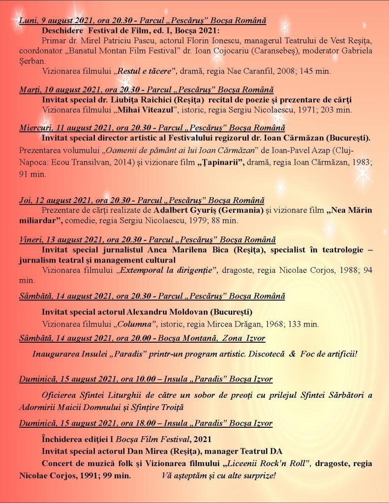 „Din câte Festivaluri am organizat în tot Banatul, cel mai numeros public în prima seară este aici la Bocșa! Vă felicit, bocșeni!” Astfel și-a început speach-ul dl. Ioan Cojocariu, coordonatorul „Banatul Montan Film Festival”, în deschiderea primei ediții a Festivalului de Film de la Bocșa, luni, 9 august 2021, provocat fiind de moderatorul Gabriela Șerban. Într-adevăr! De cum s-a lăsat răcoarea serii, bocșenii au început să se adune în Parcul „Pescăruș” din Bocșa Română pentru a participa la un eveniment inedit: prima ediție a Festivalului de Film de la Bocșa. „Orașul în care m-am născut, orașul în care am crescut, în care am făcut școala și pe care astăzi îl conduc este mai vârstnic cu zece ani decât mine și e o plăcere și o cinste deosebită pentru mine ca și la aniversarea a 60 de ani să fiu primarul acestui oraș pe care îmi doresc să-l reînvii, să-i readuc strălucirea de altădată. Iar proiectul de astăzi este unul dintre multele proiecte gândite în acest sens. Orașul nostru are nevoie de lucrări de canalizare, de asfaltare, de amenajare și întreținere a unor spații și clădiri, dar are nevoie și de cultură! Are nevoie de momente de recreere, iar eu îmi doresc să ofer bocșenilor o plajă cât mai largă de activități cultural-recreative. Îi mulțumesc prietenului meu, regizorului Ioan Cărmăzan, că a propus un astfel de proiect interesant și inedit pentru Bocșa, un Festival de Film care să debuteze cu prilejul aniversării celor 60 de ani de Oraș Bocșa! Este important ca tinerii și copiii noștri să aibă acces la tezaurul cinematografiei românești și sub această formă, adică, în aer liber, alături de prieteni, alături de alți oameni, privind împreună și bucurându-se de imagini de colecție!” preciza primarul orașului Bocșa, Mirel Patriciu Pascu în cuvântul de deschidere. De asemenea, domnia sa a mulțumit tuturor pentru prezență și a invitat bocșenii să participe și la programele desfășurate sâmbătă și duminică pe Insula „Paradis” din zona Bocșa Izvor (Bringl). După cum au gândit organizatorii programul, fiecare seară de film începe cu un eveniment cultural: un recital de poezie, o prezentare de carte, o prezentare de film sau de autor, iar pentru acest moment introductiv Festivalul beneficiază de un invitat special. În deschiderea primei ediții Bocșa Film Festival a fost invitat un fiu al locului, actorul și regizorul Florin Ionescu, managerul Teatrului de Vest Reșița. Florin Gabriel Ionescu a avut parte de o primire de excepție, bocșenii prețuindu-și valorile, iar în public aflându-se mulți prieteni și foști colegi ai invitatului. Așadar, filmul lui Nae Caramfil – „Restul e tăcere” – a avut parte de o prezentare profesionistă și cu mult succes la public! O seară frumoasă, multă lume care a socializat, care s-a bucurat de prieteni, de răcoare și de un film bun românesc!