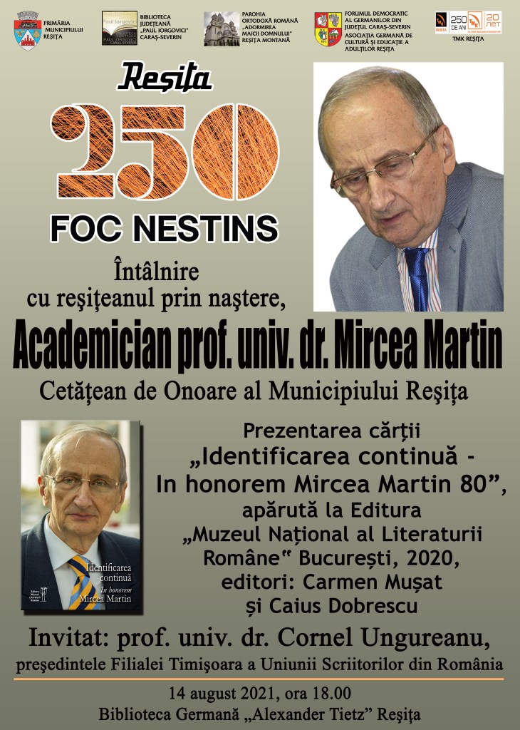 Întâlnire cu reșițeanul prin naștere, academician prof. univ. dr. Mircea Martin și prezentarea cărții „Identificarea continuă – In honorem Mircea Martin 80”, apărută la Editura „Muzeul Național al Literaturii Române“ București, 2020, editori: Carmen Mușat și Caius Dobrescu.