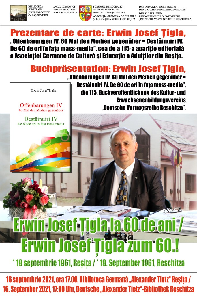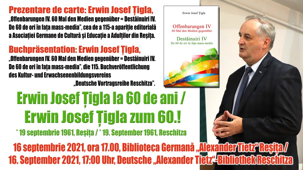 Buchpräsentation: Erwin Josef Ţigla, „Offenbarungen IV. 60 Mal den Medien gegenüber = Destăinuiri IV. De 60 de ori în fața mass-media”, die 115. Buchveröffentlichung des Kultur- und Erwachsenenbildungsvereins „Deutsche Vortragsreihe Reschitza”.