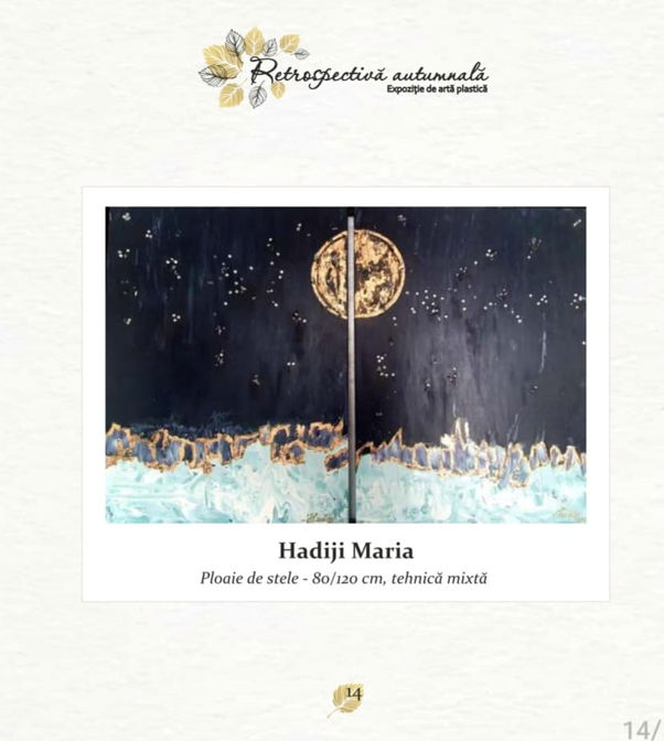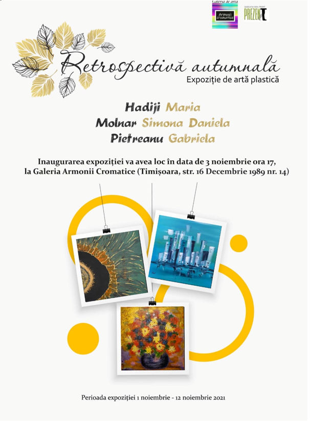 Un eveniment aducător de frumusețe, bucurie, curățire sufletească, dar mai ales aducător de lumină, într-o zi de toamnă a lui noiembrie, ziua 3, 2021, a avut loc în Timișoara, inaugurarea Expoziției de Artă Plastică, ora 17 la Galeria Armonii Cromatice (Str.16 Decembrie 1989 nr.14). Minunată toamnă în care trei frumoase doamne: Maria Hadiji, Simona Daniela Molnar, Gabriela Pietreanu, reușesc să aducă acest tablou arămiu al toamnei, clipe colorate, în sufletele celor care au trecut și vor trece pragul galeriei, iar care vor să se încarce de viață, dorințe, speranțe, trebuie să afle că o pot face în perioada 1 noiembrie până în 12 noiembrie 2021. Nu vor regreta, pentru că în aceste armonii cromatice gândurile se contopesc cu universul, sunt atât de multe povești de viață, cuvinte care intră și ies din rame, mâini invizibile îmbrățișează ființe, trimițându-le în lumi paralele pentru a le îmbrăca în copaci galbeni, sau în frunze roșii, pământ argintiu, atât de pufos, să înțelegem că avem o lume întreagă în noi, trebuie să ne menținem puternici, sănătoși și echilibrați, deținem potențial Dumnezeiesc în inimi, iată cum este așezată toamna de aceste doamne, în scaunul regal, pe fiecare tablou stă scris cu litere de imaginație: Bucură-te de viață, omule! Și omul se bucură! Cine sunt aceste trei doamne curajoase care aduc bucurie în viața noastră în aceste vremuri tulburi pe care le trăim? Cine sunt artistele cu zâmbet de copil, zâmbet care alungă fricile: singurătatea, nefericirea, degradarea, distrugerea, nonsensul și ne încarcă cu împliniri, dorința de a trăi viața cu adevărat, speranța de a ne împrieteni cu dorul vieții și care ne spune că depinde de noi să transcedem emoțiile celebrând viața și să nu uităm că suntem perfecțiunea lui Dumnezeu. Despre aceste trei doamne, pierdute în fericirea toamnei spunem: