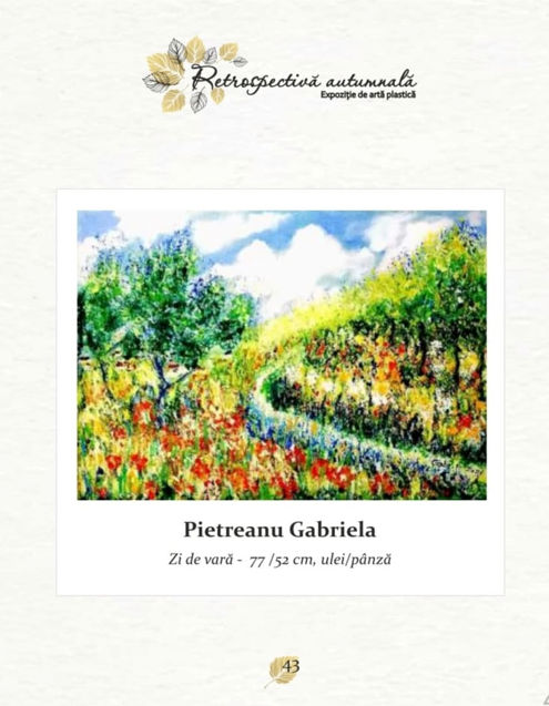 Gabriela Pietreanu, născută la data de 01.02.1953, a absolvit Facultatea de Sociologie și Psihologie Timișoara, masterandă, a absolvit Școala de Arte Timișoara. A organizat foarte multe expoziții personale, dar și expoziții de grup în multe orașe din țară, cât și în străinătate. Lucrările sale evocă parcă revenirea tuturor timpurilor la conceptul care prinde cu adevărat greutate în dorințe și așteptări, fericirea. În rest, artă și strălucire!