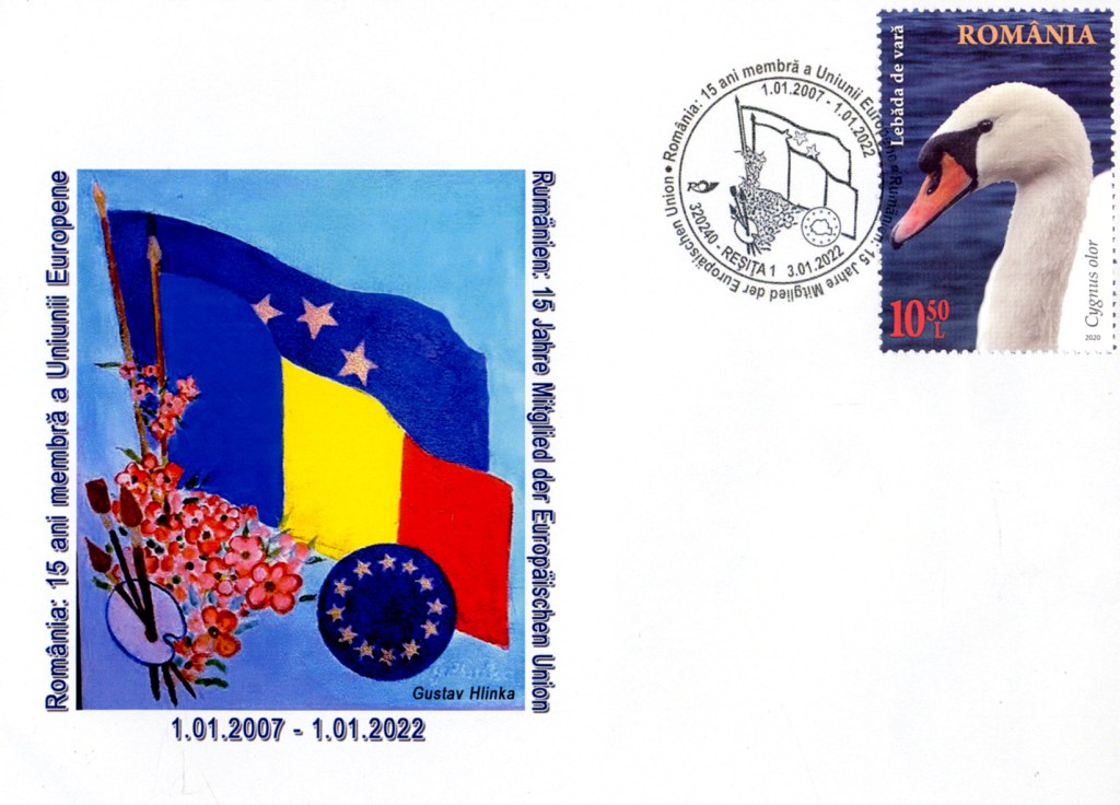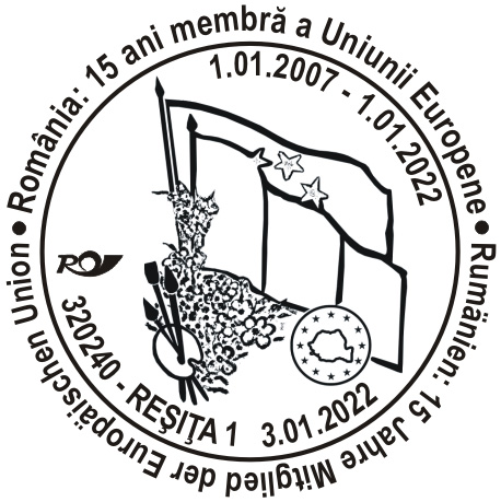 Sâmbătă, 1 ianuarie 2022, s-au împlinit 15 ani de la aderarea României la Uniunea Europeană. Asociația Germană de Cultură și Educație a Adulților Reșița și Forumul Democratic al Germanilor din județul Caraș-Severin marchează împlinirea celor 15 de ani printr-un plic filatelic ocazional și o ștampilă adecvată. Întreaga corespondență care va fi trimisă de la oficiul poștal Reșița 1 în ziua de 3 ianuarie, va fi obliterată cu această ștampilă. Pictura de pe plic îi aparține lui Gustav Hlinka din Reșița.