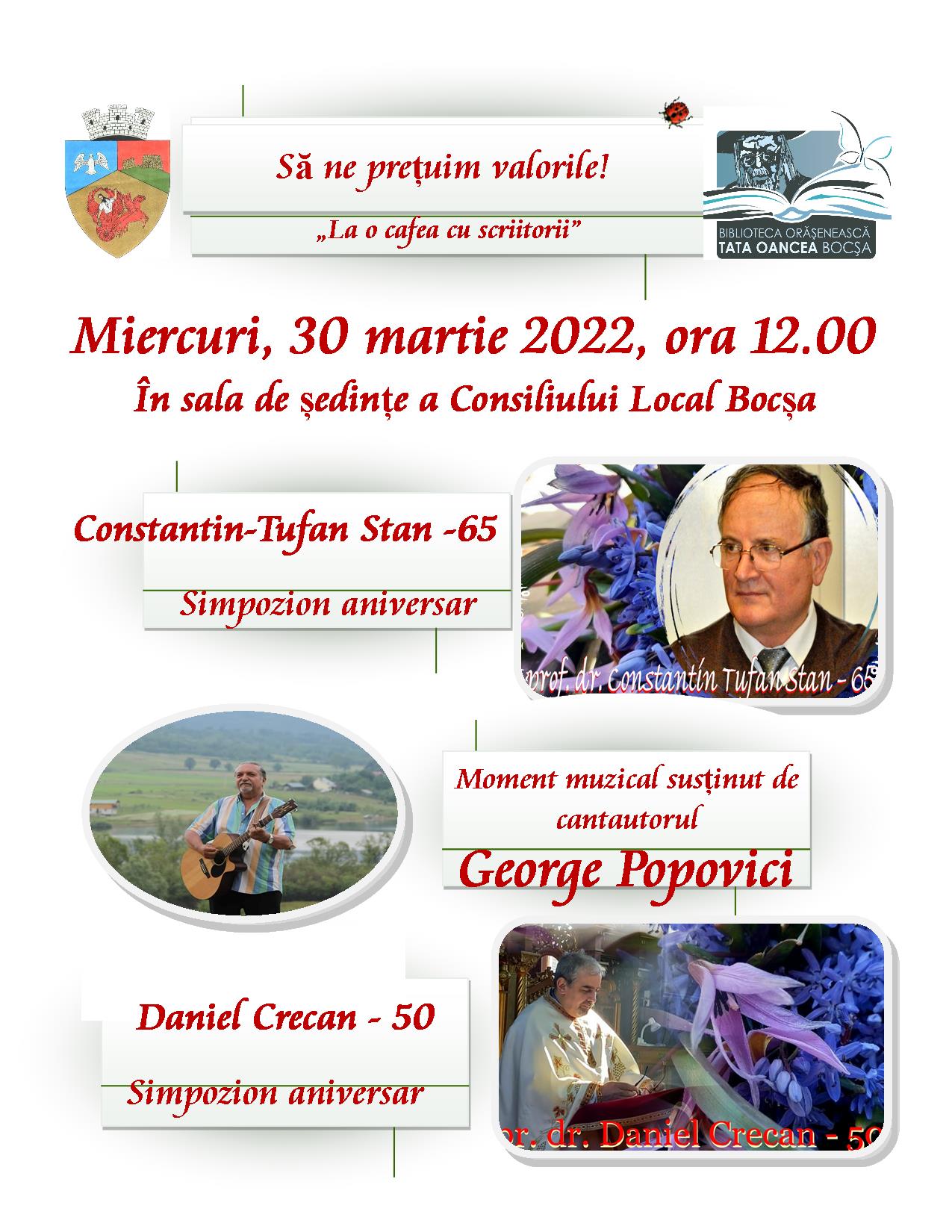 Evenimentul din 30 martie 2022 face parte din proiectul „Să ne prețuim valorile!” și i-a avut în centrul atenției pe doi oameni ai cetății, două personalități ale Bocșei, care, prin activitatea lor remarcabilă desfășurată în diferite zone, au depășit fruntariile Bocșei, aparținând întreg Banatului.