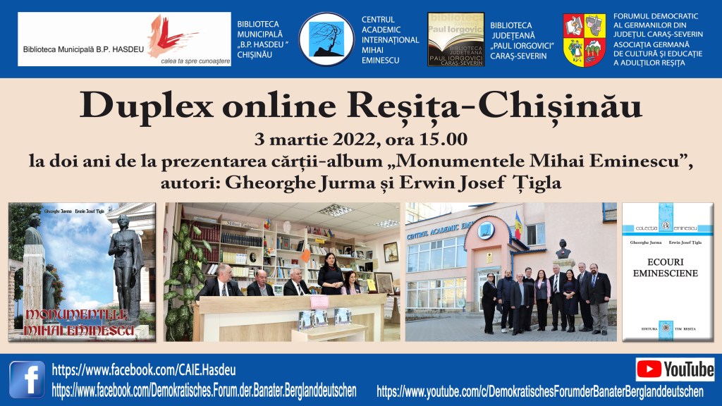 „Ne revedem sub umbra lui Eminescu”. Duplex online Reșița – Chișinău la doi ani de la prezentarea cărții-album: Gheorghe Jurma, Erwin Josef Țigla,„Monumentele Mihai Eminescu” la Centrul Academic Internațional „Mihai Eminescu” din Chișinău, în data de 3 martie 2020.