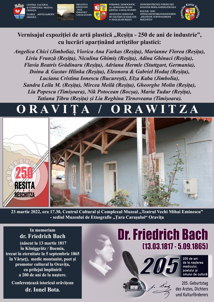 In memoriam dr. Friedrich Bach (născut la 13 martie 1817 în Königgrätz / Boemia, trecut în eternitate la 5 septembrie 1865 în Vârșeț), medic montanist, poet și promotor cultural la Oravița, cu prilejul împlinirii a 200 de ani de la naștere. Conferențează istoricul orăvițean dr. Ionel Bota.