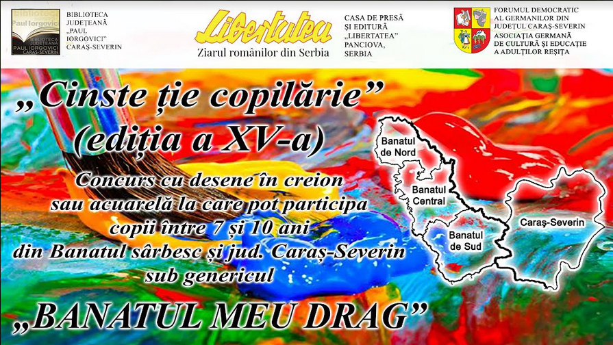 Ajunsă la cea de-a XV-a ediție, manifestarea „Cinste ție, copilărie!“ se va desfășura și anul acesta, ca și în 2021, sub forma unui concurs de desene în creion sau acuarelă. La competiție pot participa cu lucrări copii din județul Caraș-Severin și din Serbia / Banatul de Nord, Banatul Central și Banatul de Sud. Inițiată de Forumul Democratic al Germanilor din județul Caraș-Severin în urmă cu 15 ani, manifestarea „Cinste ție, copilărie!“, dedicată Zilei Internaționale a Copilului, trece în al doilea an consecutiv hotarele țării, în Banatul sârbesc. Continuăm tradiția și anul acesta, organizând această manifestare de suflet prin care ne dorim să îi simțim mai aproape pe copiii noștri, prin aptitudinilor lor artistice demonstrate cu fiecare prilej, implicând în acest sens o bună parte din Banatul istoric. Proiectul se va derula în România și în Serbia, sub forma unui concurs de desene în creion sau acuarelă, cu tema „Banatul meu drag”. Sunt invitați să participe copii cu vârste între 7 și 10 ani. Un juriu format din câte un reprezentant al fiecărui partener va acorda premiile I, II și III la cele două categorii de vârstă alese, 7 – 8 ani și 9 – 10 ani. Juriul va delibera și va anunța premianții în preajma zilei de 1 iunie 2022. Lucrările premiate vor fi postate pe rețelele de socializare ale partenerilor și vor face parte dintr-o expoziție itinerantă care va fi prezentată atât în județul Caraș-Severin, cât și în Banatul sârbesc. Desenele pentru concurs trebuie trimise prin poștă pe adresa: Biblioteca Germană „Alexander Tietz”, Bd. Revoluția din Decembrie nr. 22, RO-320086 Reșița sau NIU Libertatea, str. Žarka Zrenjanina, nr. 7, SRB-26000 Panćevo, până cel târziu în data de 10 mai 2022. Parteneri în acest proiect sunt Biblioteca Județeană „Paul Iorgovici” Caraș-Severin, Casa de Presă și Editură „Libertatea” din Panciova (Serbia), Forumul Democratic al Germanilor din județul Caraș-Severin și Asociația Germană de Cultură și Educație a Adulților Reșița. Coordonatorii concursului sunt prof. Maria Radu Nowak și Erwin Josef Țigla (Reșița).