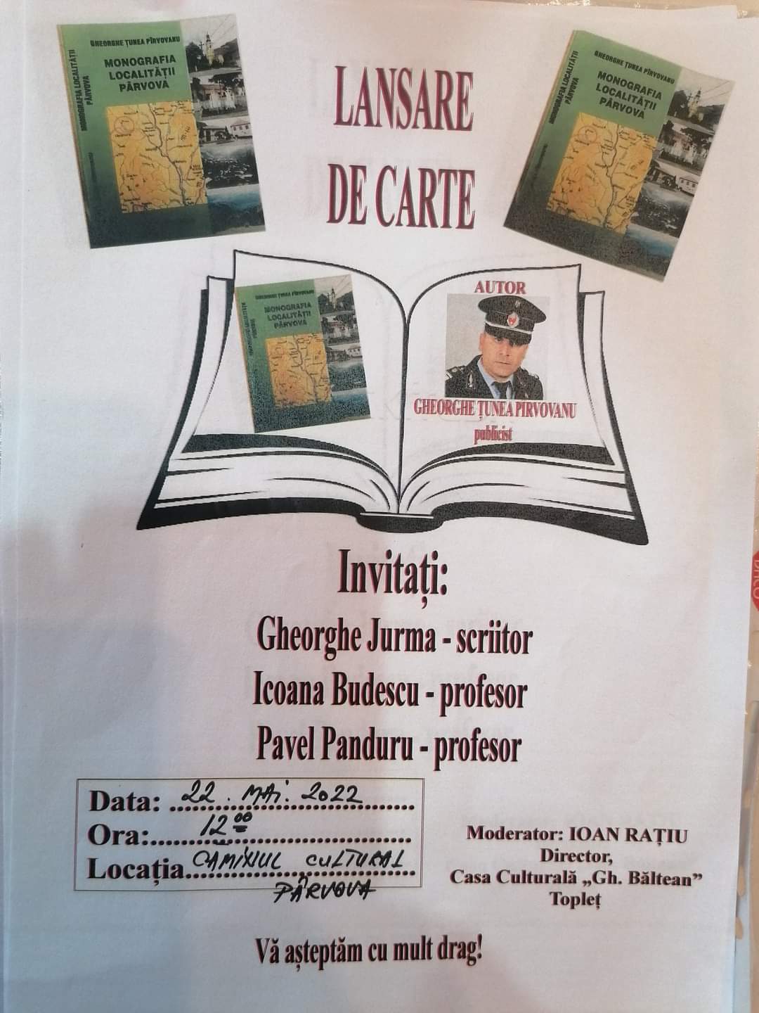 De altfel, la numai o zi de la tipărirea acestei cărţi, în data de 22 mai 2022 a avut loc lansarea acesteia în localitatea Pârvova. La această manifestare culturală, unică în felul ei, au participat oameni de cultură din Caraş-Severin şi din Timiş, cum ar fi Gheorghe Jurma, Icoana Budescu, Pavel Panduru sau Gheorghe Rancu, dar şi aproximativ 70-80 de locuitori ai satului.