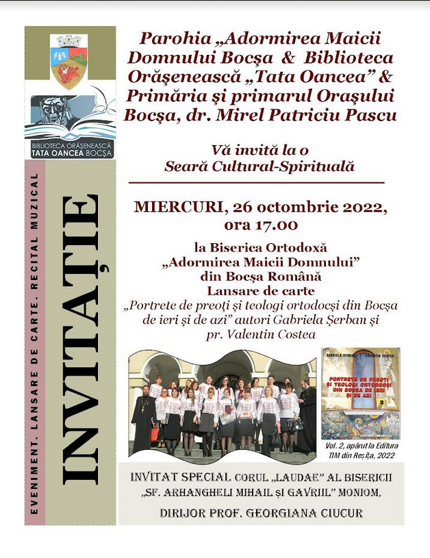 În seara praznicului Sfântului Mare Mc. Dimitrie, Izvorâtorul de Mir, la Biserica Ortodoxă „Adormirea Maicii Domnului” din Bocșa a avut loc un eveniment inedit: o seară cultural-spirituală dedicată cărții, preoților și tradițiilor românești.