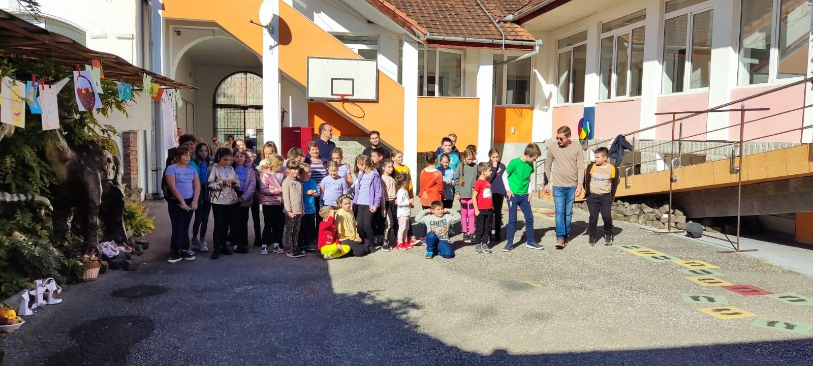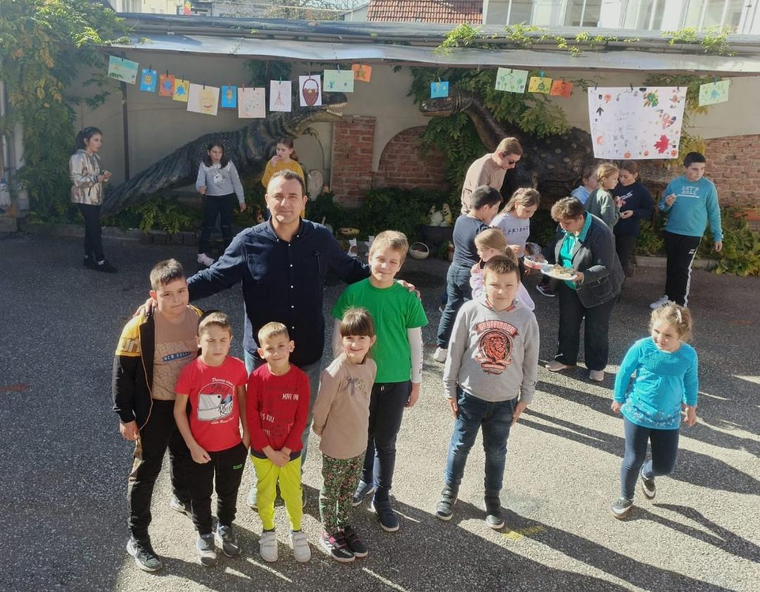 A sosit și ziua cu pricina, copiii frumoși și voioși ne-au trecut pragul. Ba mai mult, și soarele zâmbea mulțumit de ceea ce vedea în curtea noastră. Oare să fie acel zâmbet de la fețele surâzătoare ale celor mici, sau de la mirosul dulce și îmbietor de plăcinte? Da, da, și plăcinte am avut, coapte cu mult drag de doamna Maria, prietena tuturor copiilor, care și-a pus sorțul și aduce tava cu plăcinte  calde și bune, servindu-i pe toți participanții. Mai avem bomboane colorate și ademenitoare și, nu în ultimul rând, coșurile cu fructe și legume din partea copiilor.