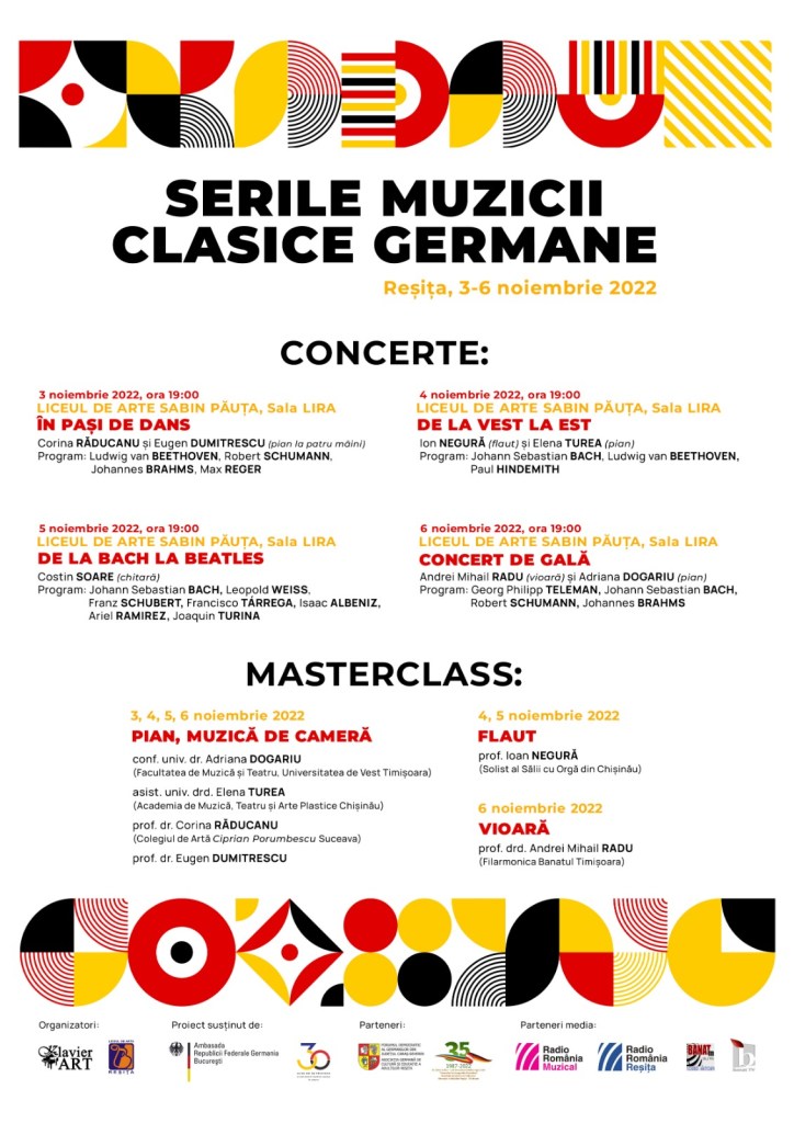 SÂMBĂTĂ, 5 noiembrie 2022 LICEUL DE ARTE SABIN PĂUȚA Reșița, Sala LIRA Ora 10:00 MasterClass – pian Elena TUREA, Corina RĂDUCANU, Eugen DUMITRESCU