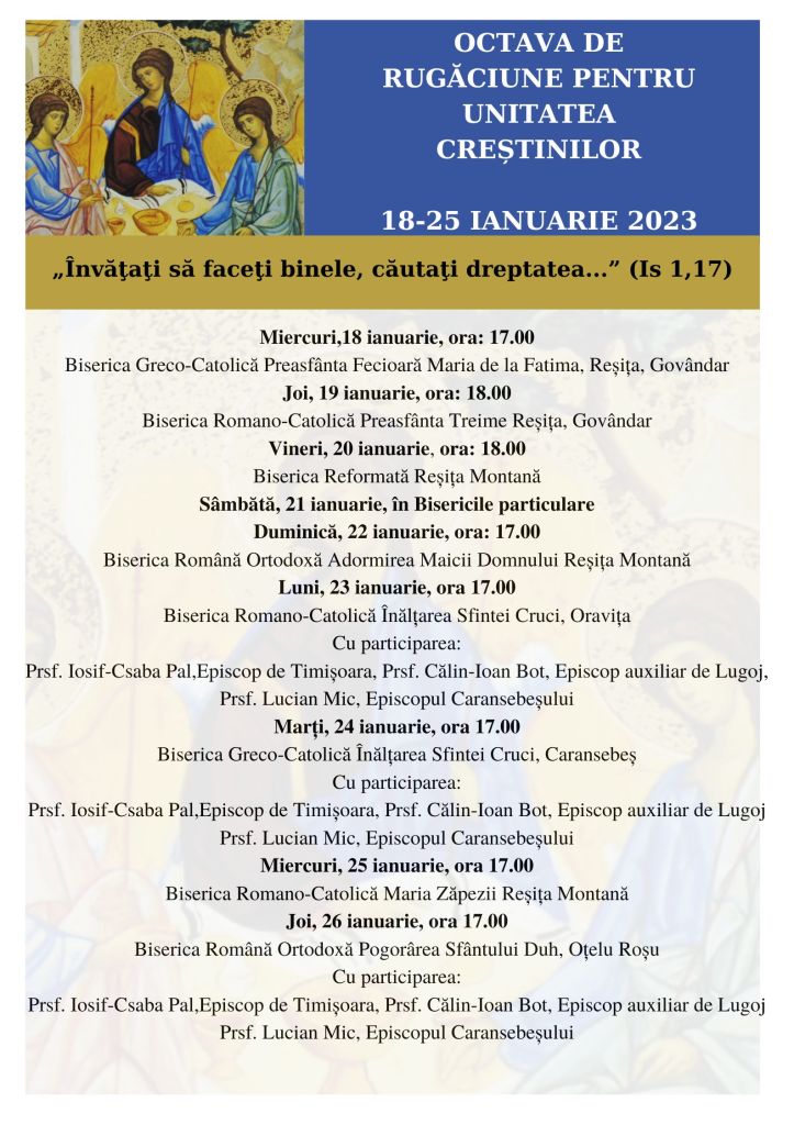 Bănățenii creștini s-au obișnuit ca în fiecare an, în a doua parte a lunii ianuarie, să se organizeze în această parte de țară Octava de rugăciune pentru unitatea creștinilor sau, cum o cunoaștem cu toții, Săptămâna de rugăciune ecumenică.