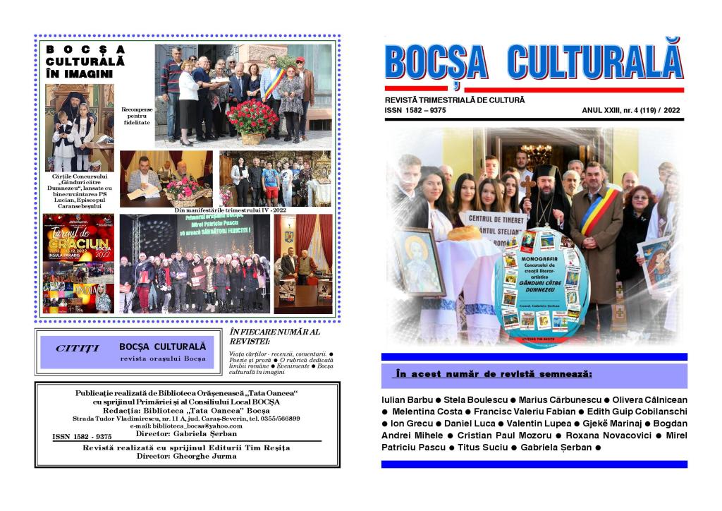 Partajează asta: Partajează pe Facebook(Se deschide într-o fereastră nouă) Facebook Partajează pe LinkedIn(Se deschide într-o fereastră nouă) LinkedIn Partajează prin WhatsApp(Se deschide într-o fereastră nouă) WhatsApp Imprimare(Se deschide într-o fereastră nouă) Imprimare Apreciază Încarc... REVISTA BOCȘA CULTURALĂ, NR.4/2022 20 ianuarie 202321 ianuarie 2023 / uzpcarasseverin / Scrie un comentariu