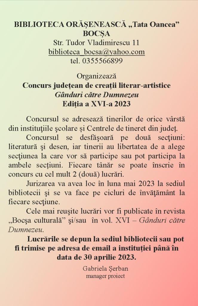 ,, Gânduri către Dumnezeu” ed. a XVI-a, 2023 6 februarie 20236 februarie 2023 / uzpcarasseverin / Scrie un comentariu Partajează asta: Partajează pe Facebook(Se deschide într-o fereastră nouă) Facebook Partajează pe LinkedIn(Se deschide într-o fereastră nouă) LinkedIn Partajează prin WhatsApp(Se deschide într-o fereastră nouă) WhatsApp Imprimare(Se deschide într-o fereastră nouă) Imprimare Apreciază Încarc...