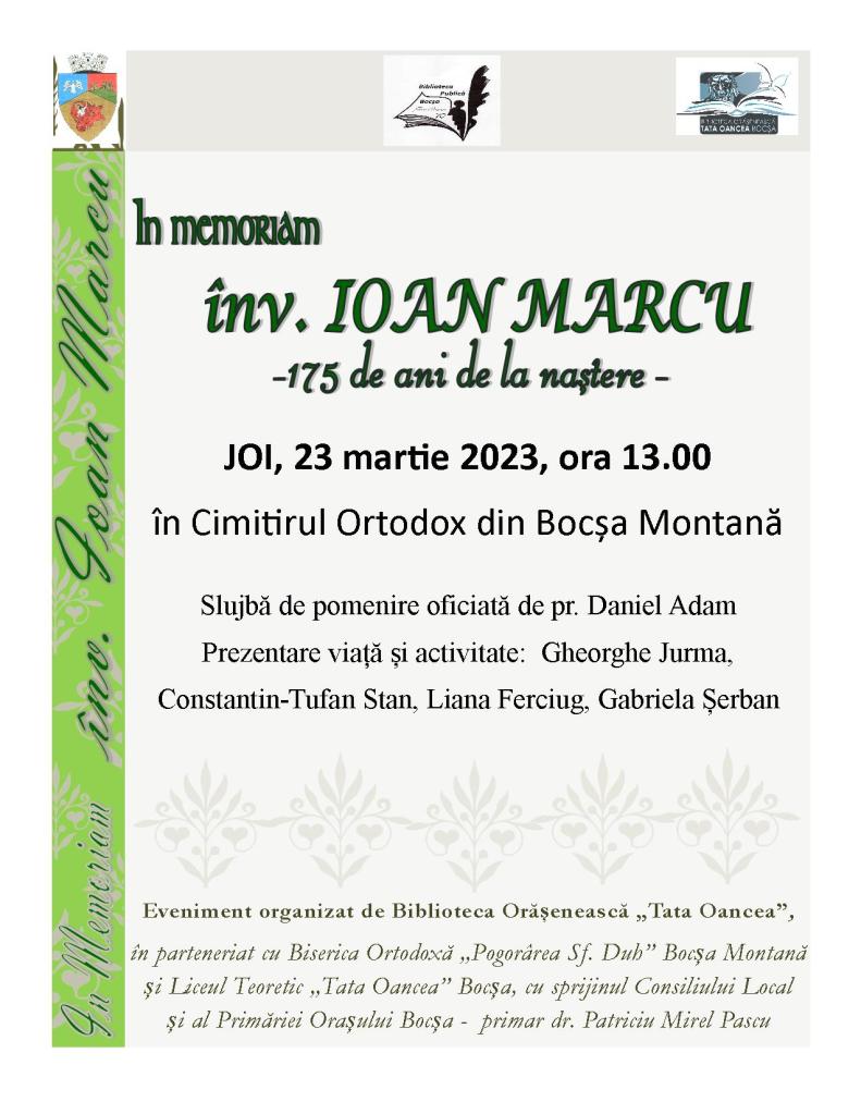 Unul din dascălii de mare vocaţie şi prestigiu ai Banatului a fost Ioan Marcu din Bocşa Montană. S-a născut în 25 ianuarie 1848 în Satul Mic (astăzi Victor Vlad Delamarina) din judeţul Timiş. A murit în 1932 şi a fost înmormântat în cimitirul din Bocşa Montană.
