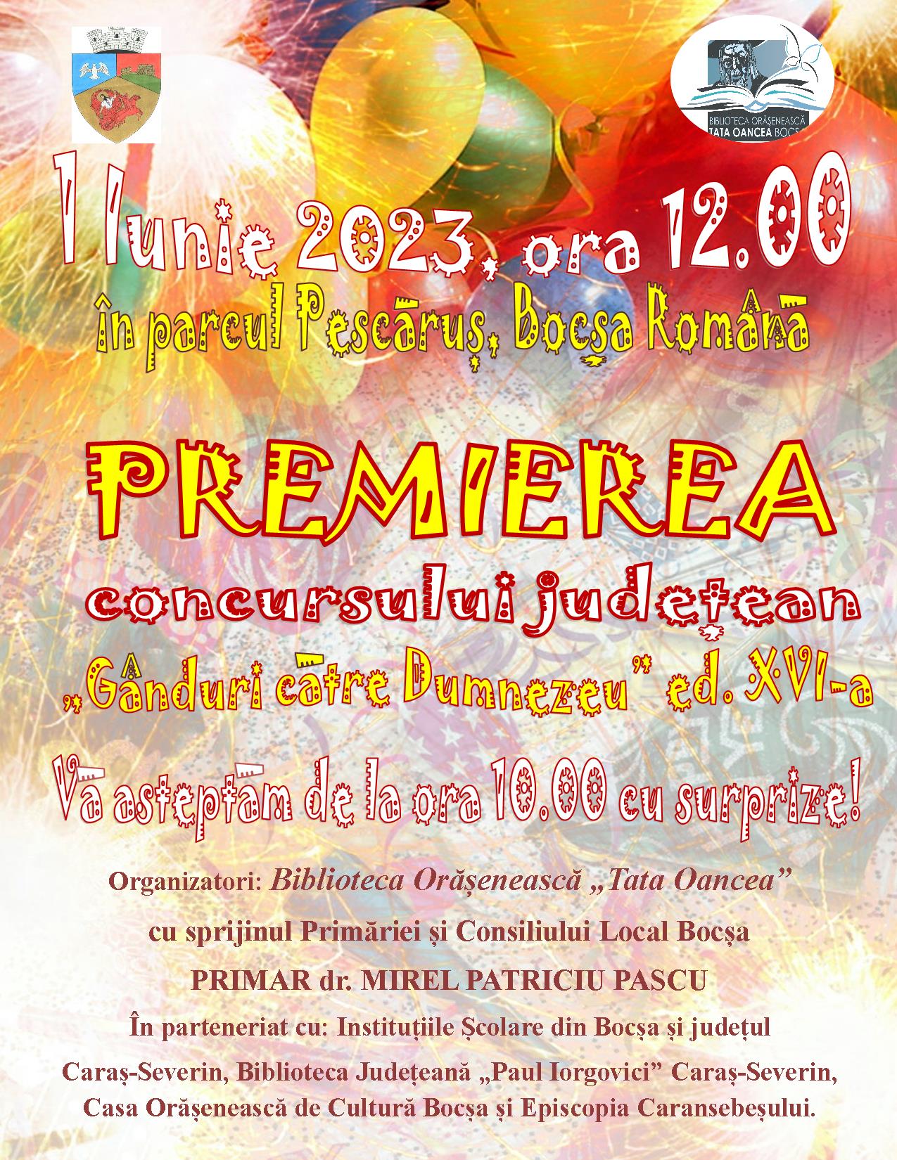 Festivitatea de premiere va avea loc în data de 1 Iunie 2023, începând cu ora 12.00, în Parcul „Pescăruș” din Bocșa Română, însă participanții sunt invitați mai devreme, începând cu ora 10.00, deoarece, împreună cu Casa Orășenească de Cultură Bocșa, sunt organizate surprize și momente artistice pentru copii. Și, de Ziua Internațională a Copilului, copii și tineri talentați ai Bocșei vor prezenta un spectacol de dansuri populare, îndrumați și instruiți fiind de profesorii Ilia Ciurcia și Octavian Pieptenaru.