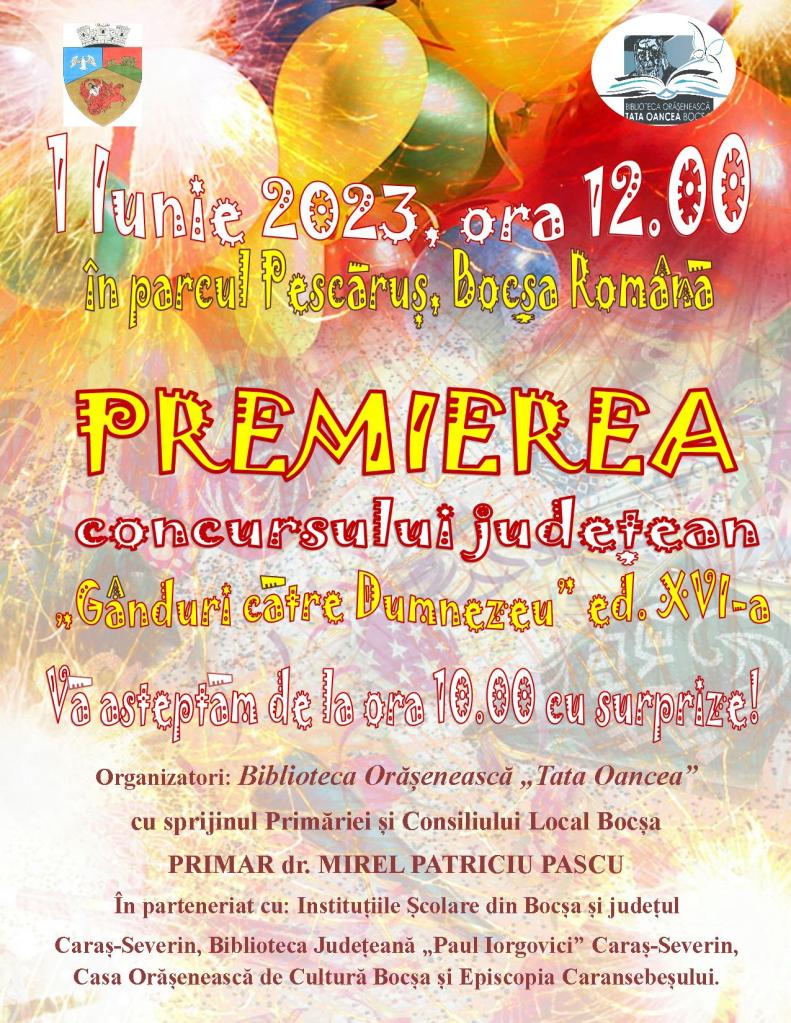 În perioada ianuarie – aprilie 2023, sub egida Bibliotecii Orășenești „Tata Oancea” Bocșa s-a desfășurat Concursul Județean de Creații Literar-Artistice „Gânduri către Dumnezeu” aflat la cea de-a XVI-a ediție.