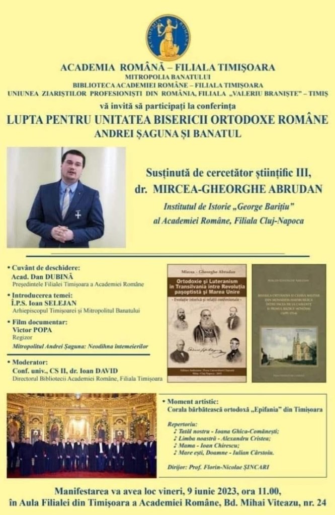 Astăzi, 9 iunie 2023, ora 11.00, în Aula Filialei din Timișoara a Academiei Române a avut loc o conferință de suflet, spun asta deoarece s-a vorbit despre ANDREI ȘAGUNA ( n. 20 decembrie1808 Miskolc, Imperiul Austriac/ d. 28 iunie 1873, Sibiu, Austro- Ungaria), mitropolitul Transilvaniei, un luptător, un vajnic apărător al drepturilor ortodocșilor și românilor din Ardeal.
