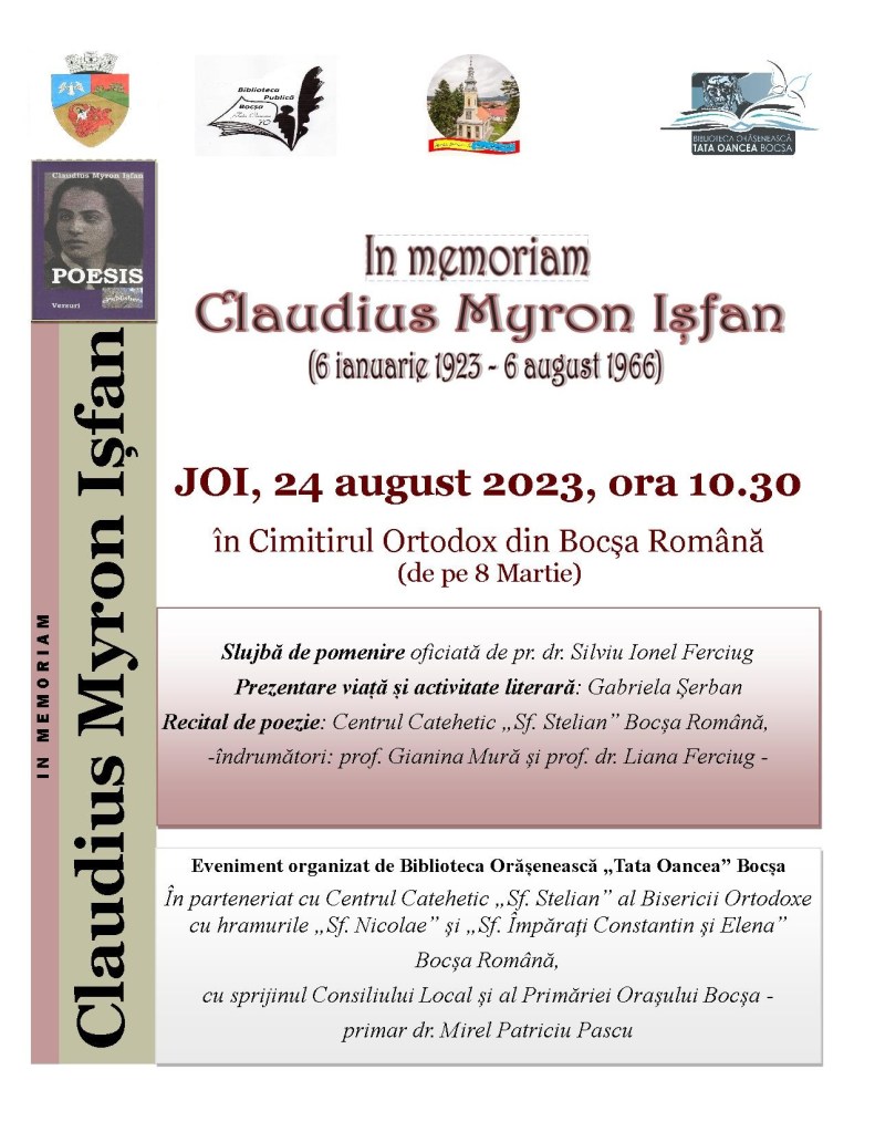 Joi, 24 august 2023, de la ora 10.30, în Cimitirul Ortodox de pe str. 8 Martie din Bocșa Română, va fi comemorat poetul bocșean Claudius Myron Ișfan printr-o slujbă de pomenire la mormântul acestuia și printr-un recital de poezie susținut de tineri din cadrul Centrului Catehetic „Sf. Stelian” Bocșa Română.