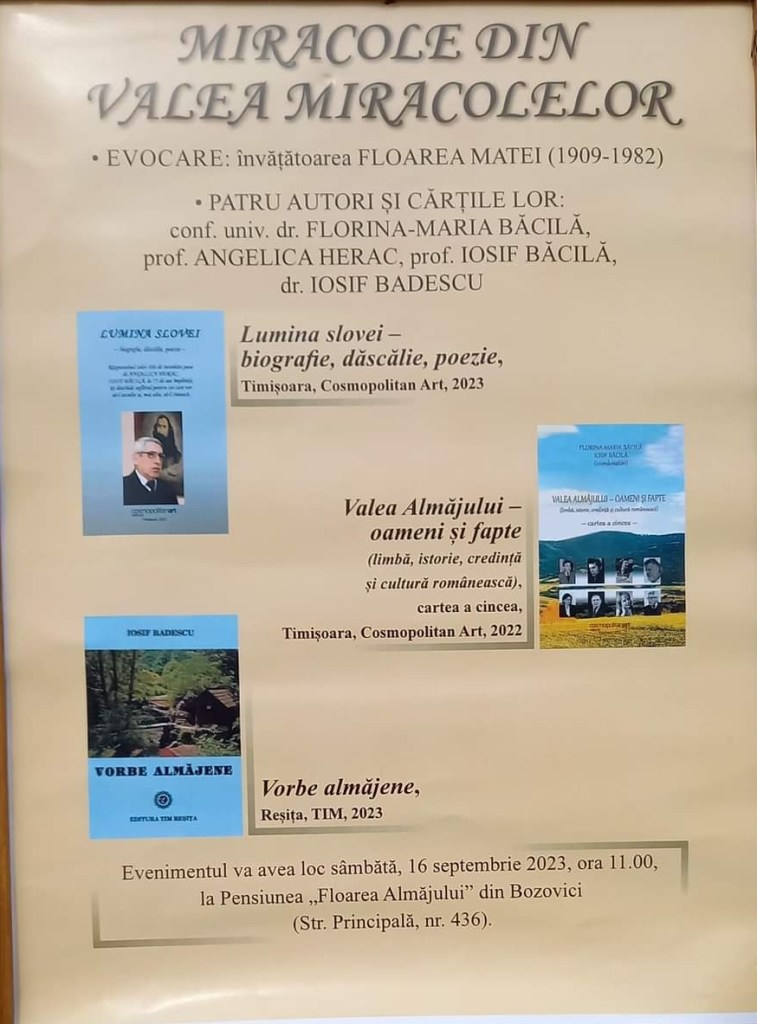 Pensiunea ,,Floarea Almăjului”, casa memorială a învățătoarei Floarea Matei din Bozovici, a găzduit în ziua de 16 septembrie 2023 o deosebită manifestare culturală, purtând un titlu extrem de sugestiv, într-un perfect acord cu motivul evenimentului: MIRACOLE DIN VALEA MIRACOLELOR. Acțiunea culturală a cuprins în miezul conținutului său prezentarea a patru cărți, respectiv a autorilor săi, și o secțiune dedicată rememorării învățătoarei Floarea Matei (1909-1982), prima femeie dirijor de fanfară din România. Gazde ale manifestării au fost soții Florentina și Mihai Cziple, proprietarii acestei frumoase pensiuni din Bozovici care este în același timp și casa memorială a învățătoarei a cărei memorie a fost evocată din nou și cu acest prilej de către doamna Florentina Cziple, gazdă a manifestării.
