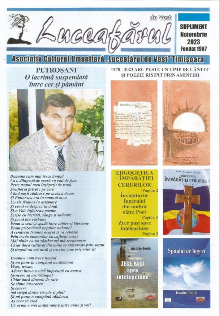 Petroșani 1978-2023, Arc peste un timp de cântec și poezie risipit prin amintiri. Sunt pentru a doua oară în orașul cu parfum de cărbune, Petroșani, județul Hunedoara. Prima oară am fost în 1978 în calitate de participant, la festivalul ,,Cântecul adâncului” organizat de Comitetul Uniunii Sindicatelor din România, Întreprinderile Miniere, Petrol, Geologie, Energie Electrică București. În acel timp eu eram muncitor la Schela de Extracție Timișoara, tânăr și entuziast și începător în ale poeziei și scrisului la ziarele vremii. Cu acest prilej a fost editată antologia ,,Cântecul adâncului” în care au fost publicați premianții dar și alți participanți printre care m-am numărat și eu. Așadar am debutat în acest volum colectiv cu poezie patriotică. De-atunci m-am ambiționat, frecventam cenaclurile literare din Timișoara, participam la diverse alte concursuri de creație organizate în țară. Am avut șansa de a cunoaște mulți iubitori de literatură, oameni cu notorietate în domeniul cultural-artistic dar și al presei de la care am învățat multe și iată, într-un timp de trudă și sacrificii am ajuns să fac parte din generația de oameni simpli care au devenit poeți, scriitori, ziariști, editori, doctori, istorici, profesori universitari, etc. creatori de bunuri spirituale benefice și mereu în slujba comunității. Se poate spune că am fost un norocos, nu știu ce să cred , eu m-am născut într-o familie lipsită de daruri și am plecat să cuceresc lumea dintr-un mediu în care sărăcia mi-a fost virtutea ce mi-a călăuzit pașii printr-un univers plin de incertitudine.