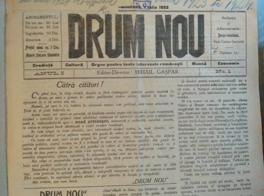 La Bocşa Mihail Gaşpar a pus bazele publicaţiei „Drum Nou”, care a apărut ca gazetă locală între 1923 şi 1929, sprijinită financiar de Uzinele de Fier şi Domeniile din Reşiţa.