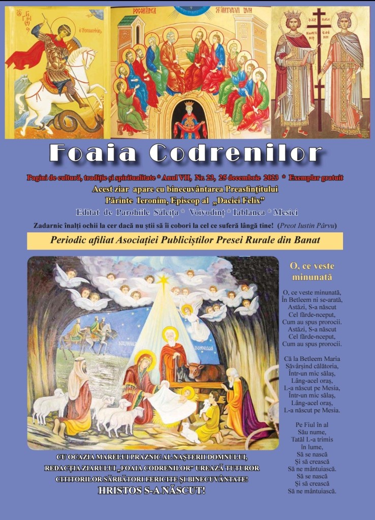 Minune și taină dumnezeiască, sărbătoare a familiei și a păcii, înveșmântată în negrăită bucurie și marcată de nădejdea mântuirii, cu icoana nașterii Domnului, Crăciunul ne adună în jurul sfintelor altare și a bradului împodobit, cetele de pițărăi și de colindători vestind tuturor că „s-a născut Domn frumos / numele Lui e Hristos!”