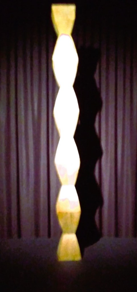 Coloana fără sfârșit a fost confecționată în atelierul artistului până în 1916 – 1917 din lemn de stejar cu forme romboide care se repetă la nesfârșit și a fost precursoarea Coloanei infinite montată în anul 1938 în Ansamblul monumental din Târgu – Jiu, având o înălțime de 30 m. Comentariul prezentat lângă lucrare menționează asemănarea cu ”stâlpii ciopliți din cimitirele românești” precum și intenția artistului de a evoca ”ascensiunea, transcendența, părând a transgresa spațiile într-o comuniune între pământ și spațiile celeste” • Brâncuși în căutarea misterului feminin