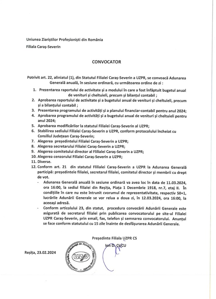 Asociația Inițiativa Ecologistă Europeană și Uniunea Ziariștilor Profesioniști din România au organizat, în data de 20 februarie 2024, conferința „România responsabilă”, prima manifestare de anvergură dintr-un domeniu care preocupă în cel mai înalt grad societatea contemporană și care cere efortul conjugat al profesioniștilor din varii domenii. Din aceste considerente, evenimentul moderat de Lavinia Șandru a reunit specialiști, reprezentanți ai autorităților centrale și locale, președinți de consilii județene, consilieri de stat, primari, antreprenori, jurnaliști, reprezentanți ai societății civile. Uniunea Ziariștilor Profesioniști din România a fost reprezentată de președintele Sorin Stanciu, de Dan Constantin, președinte al Comisiei de Atestare Profesională și de Emil Stanciu, membru al Comisiei speciale de modificare a Statutului UZPR.