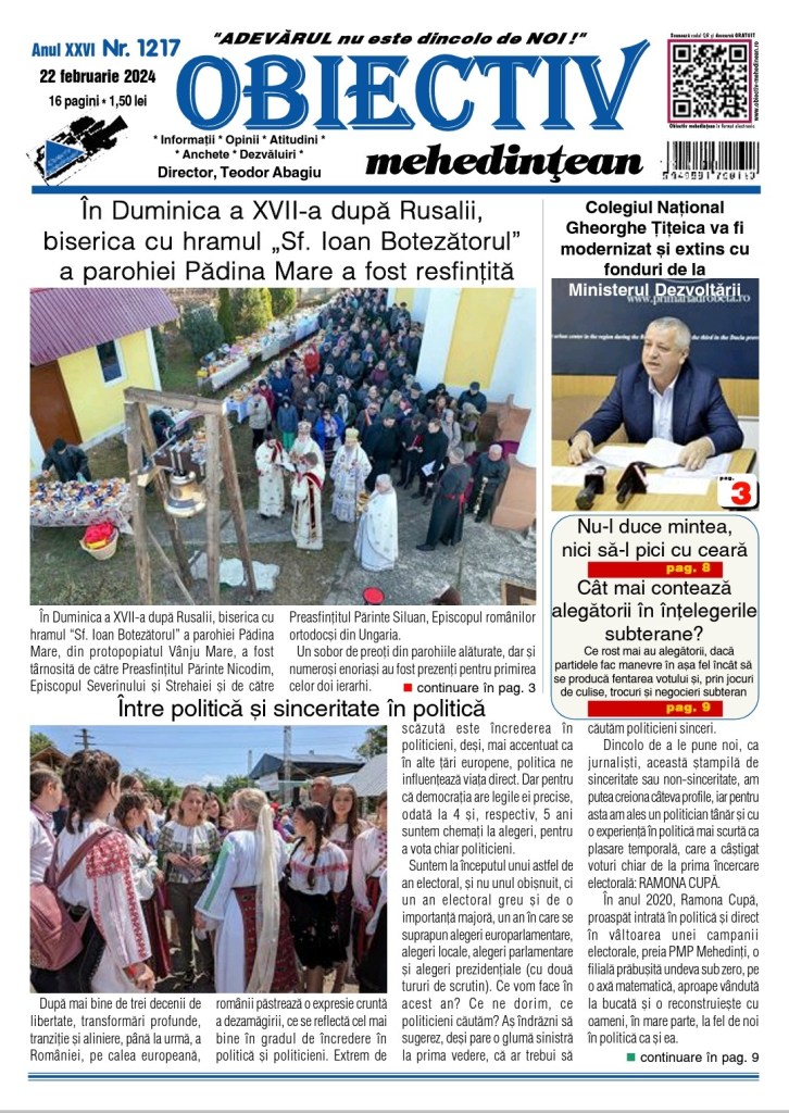 Primesc în mod constant, de la Turnu Severin de la colegul de breaslă, domnul Teodor Abagiu, săptămânalul ,,Obiectiv Mehedințean” o publicație necesară care apare în arealul jurnalistic din Zona de Vest, de 26 de ani, care aduce pe masa cititorului care dorește să fie bine informat, opinii diverse, dezvăluiri nebănuite, anchete sociale-politice-economice, informații, comentarii argumentate și nu în ultimul rând evenimente cultural-artistice și sportive. Cu un colegiu de redacție statornic și consecvent în a promova un jurnalism modern și colaboratori de prestigiu asigură un echilibru în toate compartimentele de abordare a temelor înserate în paginile acestui ziar, care mai supraviețuiește print, prin eforturile acestor oameni minunați cu sufletul risipit prin jurnalismul și cultura română. Și ce bine ar fi ca măcar noi cei puțini care mai ținem în viață, reviste și ziare să nu uităm a ne promova reciproc producțiile de spirit și conștiință în slujba comunității. Așadar să trecem a prezenta pe scurt un sumar relevant propus în recentul număr al Obiectivulul Mehedințean, care apare la Turnu Severin. Titluri inedite și cu bătaie lungă, Puncte de vedere la…vedere În Duminica a XVII-a după Rusalii, Biserica cu Hramul Sf. Ioan Botezătorul a Parohiei Pădina Mare a fost resfințită. Colegiul Național Gheorghe Țițeica va fi modernizat cu fonduri de la Ministerul Dezvoltării. Între politică și sinceritate în politică. Cît mai contează alegătorii în înțelegerile subterane dintre cei ce ne (mai) reprezintă? Poezie și Istorie la Biblioteca I.G.Bibicescu din Turnu Severin, care a găzduit recent o dublă manifestare culturală. Proiecția părții a doua a video-documentarului Tudor Vladimirescu-Istorie, Revoluție și Legendă, concept, scenariu și regia aparțin domnului Dan Șalapa, membru UZPR și lansarea a două cărți, ,Eminescu,Limba română, Credința, dedicate Marelui poet și ,,Abisul galben”semnate de poetul Dan Șalapa. Printre participanți; Poetul Victor Rusu și jurnalistul Puiu Răducan din Râmnicu Vâlcea. Dr Valentin Popescu, Mihai Logofătu, de la Fundația pentru Tineret. Poeții Emilian Iachimovski, Nicolae Calițoiu, Dan Mujescu, Adela Ionașcu, Eugenia Rada Eugen Dulbaba și Mihailo Vasilievici, scriitor, jurnalist din Kladova-Serbia, coordonator al Centrului cultural românesc, din această localitate unde trăiește o importantă comunitate de vorbitori de limbă română. Un alt Proiect cultural lansat de Poșta Română ,,Curierii Culturii-Citește și dă mai departe prin care se încurajează cititul în rândul tuturor categoriilor de vârstă, cu îndemnul ca volumele citite să fie date mai departe altor iubitori de lectură. Doamna Ramona Cupă, vicepreședinte C.J. Mehedinți ne aduce în prim plan comorile naturale inestimabile ale județului ,Topolnița , Epuran Isverna și în mod deosebit Peștera Gramei cu potențial și oportunitatea reală de a fi inclusă în circuitul turistic. Un titlul care ne dă fiori nouă celor suntem la un pas de retragerea din activitate ,,A IEȘI LA PENSIE, înseamnă A INTRA ÎN FOAME! semnat de…. Doamna Daniela Dancău, Ambasadorul României în Italia ne propune spre meditație profundă ,,Noi oportunități de cooperare între mediile economice din Italia și România. Doamna Natalia Intotero, Ministrul Familiei, Tineretului și Egalității de Șanse, s-a aflat în Mehedinți cu prilejul Campaniei naționale de distribuire de bunuri pentru beneficiarii din Centrele de tip rezidențial. Paradoxuri virusate, Andrușa R. Vătuiu, membru UZPR, ne prezintă în stilul său caracteristic subtil-ironic o radiografie a stărilor de urgență și carantină liber consimțite în perioada de p(l)andemie. Un Remember sentimental ,,În memoriam” Col. Iulică Paicu, un fiu al satului Malovăț, un om modest, simplu, foarte respectuos, care a ajutat mult biserica, s-a stins din viață la 87 de ani. Material semnat de Preot Al. Stănciulescu-Bârda. Dar ,,sarea și piperul „ acestei publicații este fără nicio îndoială colaboratorul permanent ,,nea Mărin” sub acoperire desigur, cu constatările și dezvăluirile sale acide și la subiect cu titlul ,,Sucă, Dezastrul de la Herculane, nea Folescu și Obiectu” muncii, Sănătatea fără medicamente și Căpușarea de la Complexul Energetic Oltenia. Așadar o publicație care merită și trebuie citită!