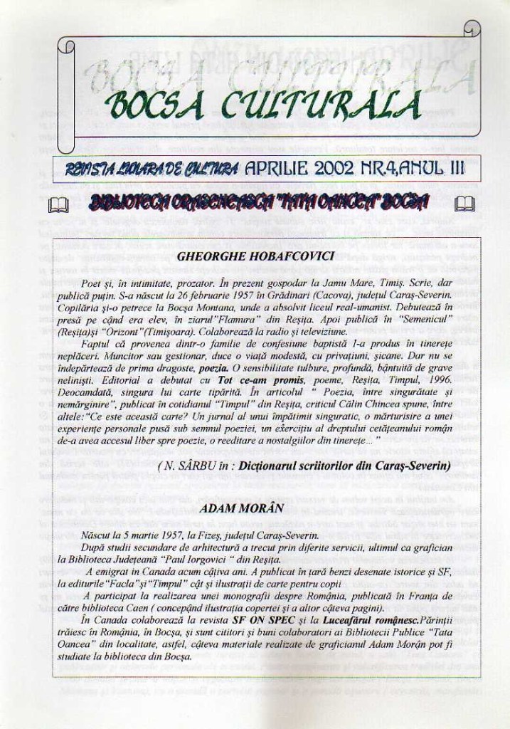 Cuprinde fapte şi evenimente culturale, creaţii literare semnate atât de autori bocşeni, cât şi de mari scriitori naţionali. Din  martie 2000 îşi schimbă  denumirea în Bocşa Culturală.