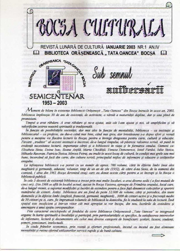 Din iunie 2003 apare în format tipărit, copertat, dar cu periodicitate trimestrială; a intrat în cel de-al 25-lea an de apariţie; se bucură de aprecieri din partea comunităţii şi administraţiei locale. Este mândria bibliotecii şi constituie o pagină în istoria culturală a localităţii. (ISBN 1582-9375)