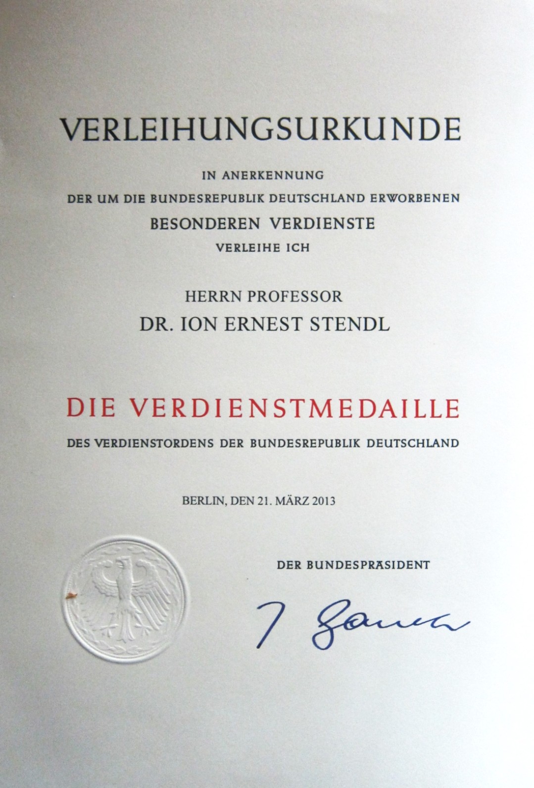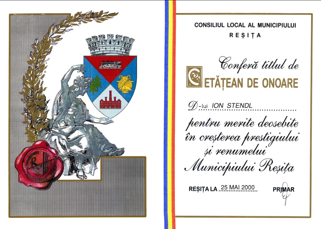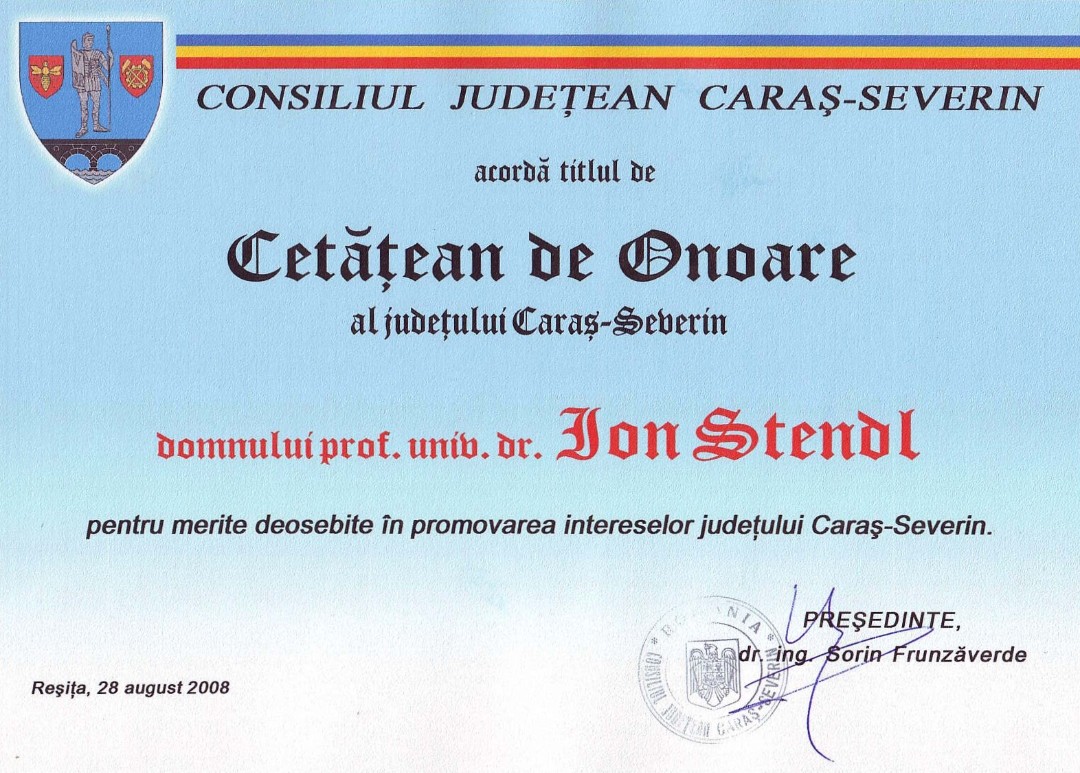 „În decursul activității mele de până acum m-am ghidat după experiența reșițeană de a acorda meseriei un loc privilegiat, ce l-am urmat cu seriozitate și perseverență. Asemeni unui experiment alchimic, am presărat în meserie un dram de poezie, ca să schimbe totul în artă. Rămâne o întrebare, dacă am izbutit… Ca un pescuitor de perle m-am scufundat mereu, dar am ieșit la suprafață de cele mai multe ori cu un pumn de nisip! Am plecat de acasă la 18 ani, am studiat și mi-am găsit rostul la București, dar parcă în acest lung răstimp am stat mereu cu picioarele desculțe în Bârzava, înconjurat de Dealul Crucii, Dealul Golului și Driglovăţ… Mai am un reazim: casa din Colonia Oltului nr. 6, unde m-am născut, am copilărit și care apare mereu în visele mele. După plecarea părinților mei în lunga lor călătorie fără întoarcere, mi-au rămas mai departe Bârzava și dealurile din jur, dar și un larg cerc de prieteni care mă iubesc și mă ocrotesc, și datorită dumnealor sunt azi aici prezent. Sunt adânc emoționat, onorat peste măsură de acordarea acestei înalte distincții pe care o înserez ca o nestemată în palmaresul meu și pentru care vă mulțumesc din inimă!” Cu aceste cuvinte simple și totuși pline de sens, artistul plastic de renume internațional Ion Stendl a mulțumit Consiliului Județean Caraș-Severin la data de 19 noiembrie 2008 pentru înalta onoare care i-a fost dată, de a fi numit Cetățean de Onoare al județului Caraș-Severin. Pentru noi, reșițenii și locuitorii Banatului Montan deopotrivă, Ion Ernest Stendl înseamnă foarte mult. Născut pe meleagurile Reșiței în data de 18 februarie 1939, a urmat între anii 1945 și 1956 Școala elementară și Liceul Mixt la Reșița, după care, între anii 1957 – 1963, a studiat la Institutul de Arte Plastice „Nicolae Grigorescu” din București, Facultatea de Arte Decorative, secția Pictură Monumentală, cu profesorii Ion Popescu-Negreni, Ștefan Constantinescu și Gheorghe Popescu. În anul 1962 s-a căsătorit cu Teodora Moisescu, colegă de studii, de asemenea un nume de referință în arta plastică românească contemporană. Cu imense regrete, după 60 de ani de căsnicie, Teodora Moisescu-Stendl a părăsit această lume în data de 24 ianuarie 2023. Uniunea Artiștilor Profesioniști din România a făcut referire despre ea în anunțul decesului, ca fiind „una dintre doamnele artei contemporane românești”. În anul 1963, după absolvirea studiilor, Ion Stendl a fost repartizat preparator la Catedra de Pictură Monumentală, în anul 1966 a devenit asistent, iar în 1973 lector. Avansarea ulterioară i-a fost oprită, nefiind membru P.C.R. Reparator, în anul 1990, a fost numit profesor la catedra de Artă Murală, activând ca profesor până ieșirea la pensie. În anul 2002 a susținut o teză de doctorat în Arte Vizuale la Universitatea Națională de Arte din București, cu tema „Desenul – estetica, suporturi, materiale”. Expoziții personale în țară purtând numele de Ion Stendl au fost nenumărate, dar o evidențiem aici numai pe prima: 1966, București, Sala „Kalinderu”. A participat, de asemenea, la numeroase expoziții internaționale, precum : 1967 – Tokyo; 1967, 1975, 1977, 1979, 1981 – Ljubljana; 1968, 1970 – Buenos Aires; 1968, 1972, 1978 – Geneva; 1969 – Paris; 1969, între 1970 și 1981 – Barcelona; 1970, 1977, 1979 – Viena; 1970, 1972 – Banska-Bistrica; 1970, 1972, 1974, 1978 – Cracovia; 1972 – Bruxelles; 1972 – Veneția; 1972, 1976, 1978 – Frechen; 1972 – Noto; 1973 – Milano; 1974, 1978 – Erfurt; 1974, 1976, 1978, 1980 – Rijeka; 1977 – New York; 1978 – Friedrikstad; 1978 – Wroclaw; 1979, 1980 – Kyoto; 1979 – Tuzla; 1980 – Berlin; 1981 – Baden-Baden; 1982 – Bilbao; 1982 – Mulhouse; 1982 – Sofia; 1982 – Grenchen; 1983 – Biella; 1984 – Chicago; 1985 – Lahti; 1985 – Varna; 1988 – Ankara; 1989 – Grenoble; 1990 – Mirabel; 1990 – Darmstadt, Mathildenhöhe; 1993 – Amersfoort; 1993 – Budapesta; 1998 – Leipzig; 2009 – Ulm; 2009 – Beratzhausen; 2014 – München. Alte participări, la expoziții de grup, au fost: 1976 – Paris; 1983 – Sofia; 1984 – Viena, Athena și Mannheim; 1990 – Namur; 1991 – Wageningen; 1993, 1999 – Nürnberg; 1993, 1994, 1995 – Beratzhausen, Zehentstadel; 1994 – București – Bonn; 1995 – Timișoara, Budapesta și München; 1995 – Nijmegen; 1997 – București; 1997 – Nürnberg; 1998 – Amstelveel; 2004 – București și Cluj Napoca; 2010 și 2019 – București. Din 1963 a participat la aproape toate manifestările expoziționale naționale, precum și la numeroase expoziții de artă românească în străinătate. Și iată o parte dintre premiile primite: 1969 – Paris, Premiul Bienalei de tineret; 1970 – Cracovia, Medalie la cea de a 3-a Bienală; 1970 – Banska-Bistrica, Mențiune de onoare; 1972 – Noto, Premiul II ex aequo al Bienalei de artă; 1974 – Barcelona, Mențiunea a 3-a la concursul Joan Miró; 1977 – Viena, Premiu al Bienalei; 1983 – București, Premiul revistei „Arta“; 1984 – București, Premiul „Ion Andreescu” al Academiei Române; 1984 – Chicago, Placheta de aur la Expoziția internațională de afiș de film; 1995 – București, Premiul special al Uniunii Artiștilor Plastici; 2000 – București, Ordinul Național „Serviciul Credincios” în grad de Ofițer; 2013 – Medalia de merit a Ordinul de Merit al Republicii Federale a Germaniei, în urma un decret semnat de președintele Germaniei de la acea vreme, Joachim Gauck. Germanii din Banatul Montan i-au conferit cea mai înaltă distincție pe care o acordă anual, Premiul „Alexander Tietz” pentru merite deosebite, în data de 17 noiembrie 2012. Până în prezent au apărut următoarele cărți și albume semnate Ion Stendl: „Teodora și Ion Stendl”, album, Editura „Institutul Cu