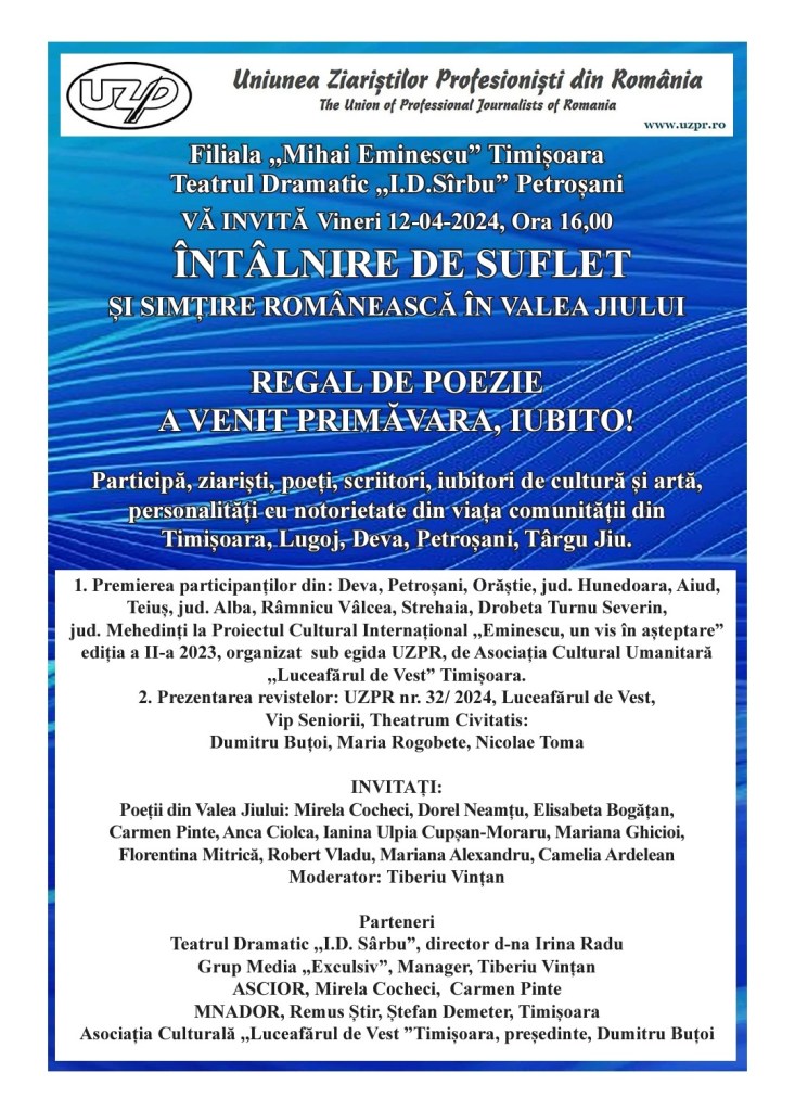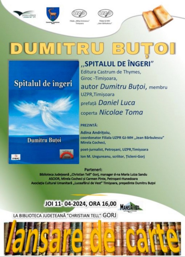 Biblioteca județeană ,,Christian Tell” Târgu Jiu, prin amabilitatea doamnei manager Maria Luiza Sandu, este gazda generoasă a unor evenimente inedite respectiv; lansarea de carte, 11 aprilie – ora 16,00 ,,Spitalul de îngeri” volum de poezie autor Dumitru Buțoi, poet și membru UZPR Filiala ,,Mihai Eminescu” Timișoara, premierea participanților la Proiectul Cultural Internațional ,,Eminescu, un vis în așteptare” ediția a II-a 2023, organizat sub egida UZPR, de către Asociația Cultural Umanitară ,,Luceafărul de Vest” Timișoara. Vor mai fi prezentate revistele UZPR și VIP Seniorii Timișoara. În continuare va fi sărbătorit distinsul profesor și om de cultură ION TRANCĂU, cu prilejul împlinirii a 85 de ani de viață. La mulți ani, cu sănătate domnule profesor! A doua zi vom fi prezenți la întâlnirea de suflet și simțire românească, găzduită de Teatrul Dramatic ,,I.D. Sîrbu” din Petroșani, director doamna Irina Radu, căreia îi mulțumim pentru receptivitate. Și aici vom premia participanții la Proiectul Cultural ,,Eminescu, un vis în așteptare”. Împreună cu colegii vom efectua vizite de lucru la Universitatea din Petroșani și Muzeul Mineritului, mulțumim domnului rector Radu Sorin pentru disponibilitate. La ambele evenimente vor participa, colegi jurnaliști, scriitori poeți, iubitori de cultură și artă, invitați-premianții din județele, Vâlcea, Olt, Mehedinți, Hunedoara, Alba. Mulțumim de asemenea partenerilor noștri; Adina Andrițoiu, UZPR Gorj-Mehedinți, Mirela Cocheci, Elisabeta Bogățan Dorel Neamțu, UZPR, domnului Tiberiu Vințan, Exclusiv Media Grup Petroșani și masss media gorjeană.