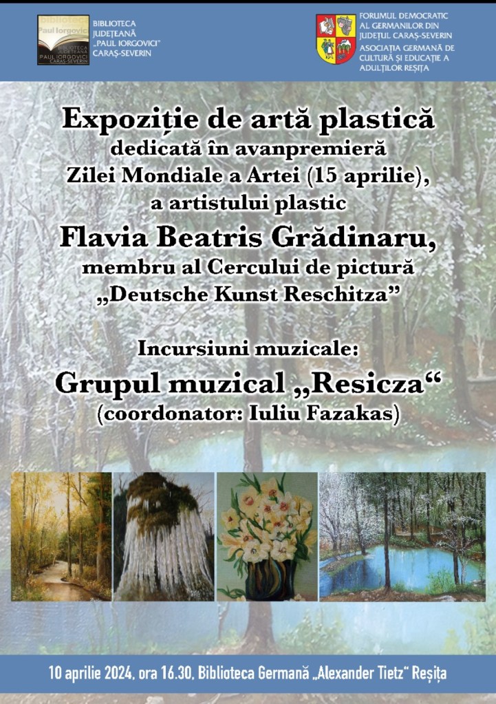 Expoziție de artă plastică dedicată în avanpremieră Zilei Mondiale a Artei (15 aprilie), a artistului plastic Flavia Beatris Grădinaru, membru al Cercului de pictură „Deutsche Kunst Reschitza”.