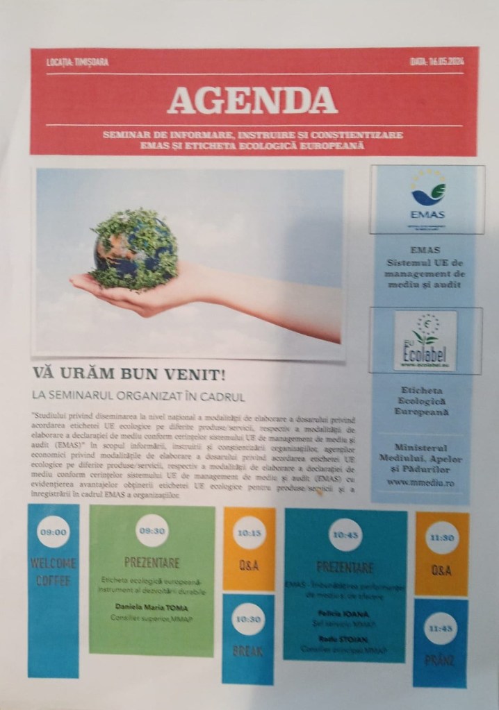 Seminar de informare, instruire și conștientizare EMAS și Eticheta Ecologică Europeană Europa este ,,o pădure de etichete” cu un mesaj controversat de (dez)informare dar și de credibilitate prin care trecem cotidian cu voluptate, precum trece printr-o istorie nocivă, țăranul cu desaga în spate! Și totuși optimiști și cotropiți de emisii, zgomote ori alte accidente, îmbrățișăm apoteotic fiecare răsărit de soare, chiar dacă Planeta respiră tot mai greu și viața noastră a devenit un poligon de încercare! Dincolo de aceste ,,fulgurații”, cu profundă tentă de meditație și implicare (in)directă în promovarea unui mediu curat și sănătos, să ,,trecem la verde” cu eticheta ecologică U.E. pentru o lume înfloritoare, așa cum ne îndeamnă organizatorii, respectiv ONG ASURA din București, în parteneriat cu UZPR, o organizație cu un nucleu de oameni simpli dar inimoși și dornici de a ne împărtăși din experiența lor acumulată cu prilejul deselor întâlniri prin orașe de referință din România, așa cum, recent, s-a-ntâmplat în Sala conferințe a Restaurantului ,,Boavista” din Timișoara. Eveniment inedit și de actualitate la care am participat împreună cu colegii de breaslă, Grigore Mâinea și Horia Țîru. Eveniment propus în dezbatere națională de cadre de specialitate în domeniu, Felicia Ioana și Daniela Maria Toma, sub egida Ministerului Mediului Apelor și Pădurilor. Pentru a înțelege și mai bine ce reprezintă de fapt Eticheta UE Ecologică, redăm pe scurt explicația necesară din pliantul pus la dispoziție de organizatori: „Sistemul UE de etichetare ecologică face parte din politica privind consumul și producția durabile ale Comunității, care are ca obiectiv reducerea impactului negativ al consumului și producției asupra mediului, sănătății, climei și resurselor naturale. Sistemul este destinat să promoveze acele produse care au un nivel înalt de performanță de mediu, prin utilizarea etichetei ecologice. Prin acest sistem producătorii, importatorii și prestatorii de serviciu pot depune cereri de acordare a etichetei ecologice a UE. Comercianții și distribuitorii pot depune cereri numai pentru produsele comercializate sub mărcile proprii.” Prezentarea a avut un caracter interactiv la care participanții, avizați în probleme de mediu și nu numai, au formulat diverse întrebări referitoare la mecanismul de reciclare, inițierea procesului de obținere a etichetei ecologice, legislația în vigoare și actualizată și activități adresate presei cu trimitere la sectorul de marketing. Precizăm că obținerea Etichetei Ecologice EU garantează un înalt nivel de fiabilitate și credibilitate. Au formulat întrebări, Anca Seici, Alinda Neagu, Vîjiac Iuxu și Cristian Neagu, desigur că răspunsurile au fost argumentate, lămuritoare și benefice pentru toți participanții. În partea a doua subiectul în dezbatere l-a constituit Sistemul de Management de Mediu și Audit – EMAS, care reprezintă un model pentru organizații, care conduce la optimizarea proceselor de producție, reducerea impactului asupra mediului și utilizarea eficientă a resurselor, în contextul Consumului și Producției Durabile a Planului de acțiune pentru Politica Industrială Durabilă a UE. Avantaje și beneficii: credibilitate, transparență și reputație sporite, gestionarea riscurilor de mediu și oportunități de management, performanță sporită de mediu și financiară, îmbunătățirea și motivarea angajaților, care la rândul lor sunt benefice consumatorului. Regulamentul EMAS se aplică în toate cele 27 de state ale UE, celor trei state ale Spațiului European precum și statelor candidate la aderarea la Uniunea Europeană. În concluzie putem aprecia strădaniile ONG ASURA și deopotrivă a celor implicați în promovarea acestui proiect de utilitate și sănătate publică la nivel național prin diverse modalități. Avem resurse, să nu le irosim, avem potențial, să-l valorificăm cât mai bine pentru binele Dumneavoastră, mai bine pentru un mediu curat în care cu toții să respirăm un aer de calitate.