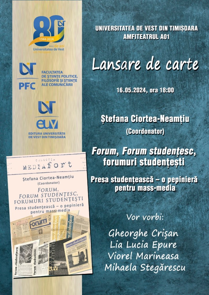 În 16 mai, de la ora 18.00, în Amfiteatrul A01 al Universității de Vest din Timișoara se va lansa volumul „Forum, Forum studențesc, forumuri studențești. Presa studenţească – o pepinieră pentru mass-media”, coordonat de Ștefana Ciortea-Neamțiu.