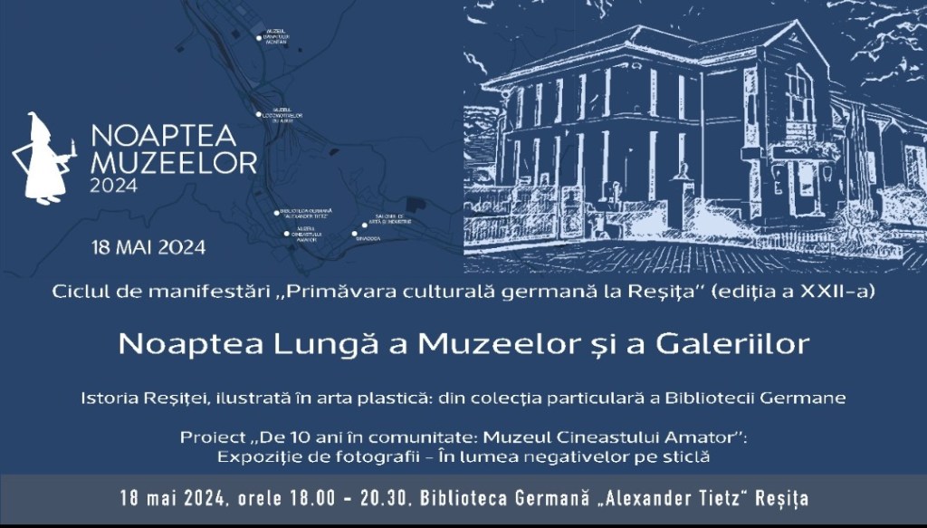Avem deosebita onoare de a vă invita la o vizită la Biblioteca Germană „Alexander Tietz” din municipiul Reșița în cadrul proiectului NOAPTEA MUZEELOR. Biblioteca va fi deschisă sâmbătă, 18 mai 2024, între orele 18:00 și 20:30. Am spus din nou afirmativ la invitația venită din partea Muzeului Cineastului Amator Reșița de a ne alătura acestei inițiative locale, naționale și internaționale. Anul acesta vom prezenta vizitatorilor două expoziții: