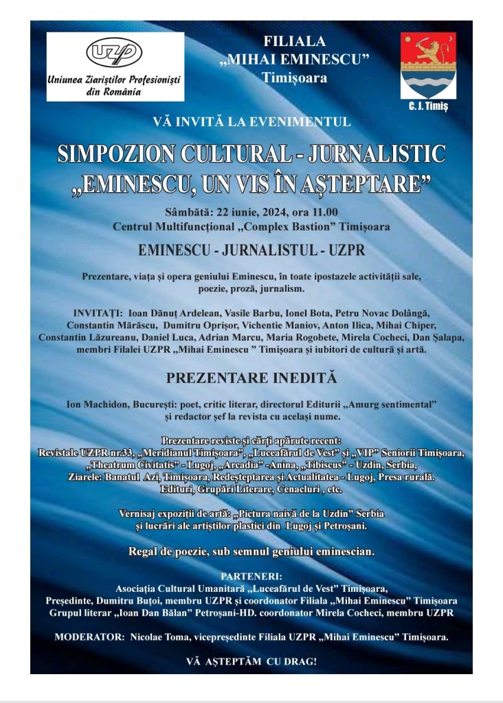Sâmbătă 22 iunie 2024, ora 11,00, la Centrul Multifuncțional din Complexul Bastion Timișoara, Filiala UZPR ,,Mihai Eminescu”, împreună cu poeți, scriitori, iubitori de cultură și artă, din Zona de Vest a țării și nu numai se vor întâlni sub semnul geniului eminescian, pentru a-l readuce în actualitate pe dragul nostru Emin… ca un gest de cinstire, prețuire a personalității sale în domeniile poezie, proză și în mod deosebit al jurnalismului. Simpozionul se va încheia cu un regal de poezie și cântec, protagoniști cantautorii Vasile Gondoci și Grigore Mâinea. De-asemeni, participanții vor avea fericitul prilej de a vizita Muzeul POPA’S, din Complexul Bastion Timișoara. Mulțumim C. J.Timiș.